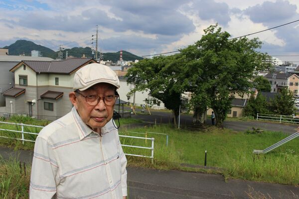 80年前に避難した長良川の堤防で当時の様子を思い返す藤井義一さん。水道山(中央奥)の上空から迫るB29爆撃機の機影を必死に目で追ったという=6月25日、岐阜市内