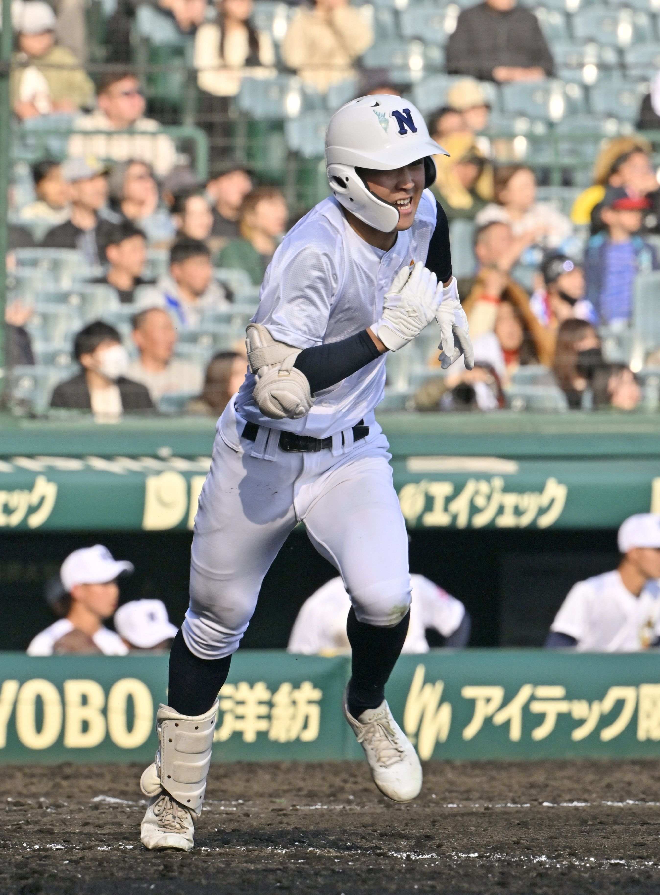 8回、佐野日大の杉田が左前打を放つ=甲子園、広瀬華撮影