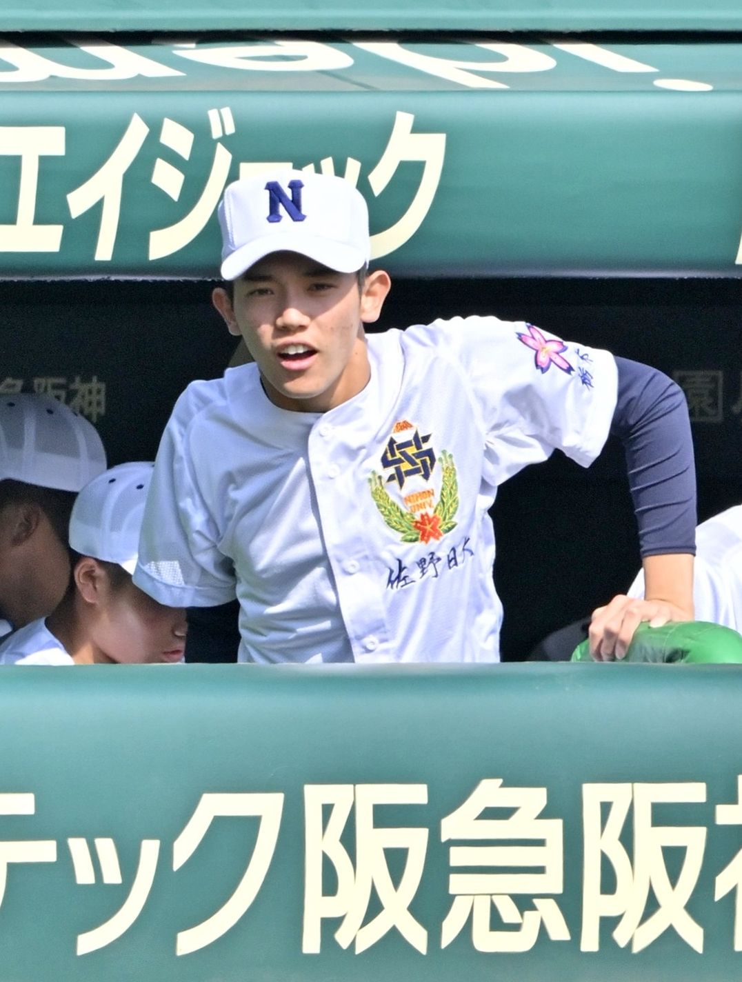 試合開始前、ベンチからグラウンドを見つめる佐野日大の吉澤=甲子園、広瀬華撮影