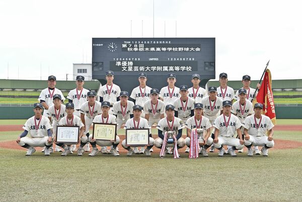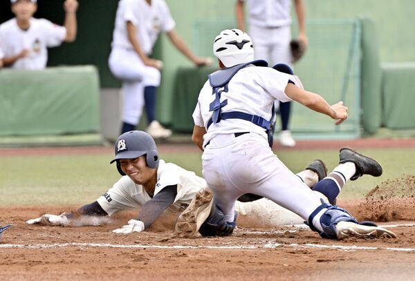 8回、文星付・高田の適時二塁打で一走の鈴木が生還=広瀬華撮影