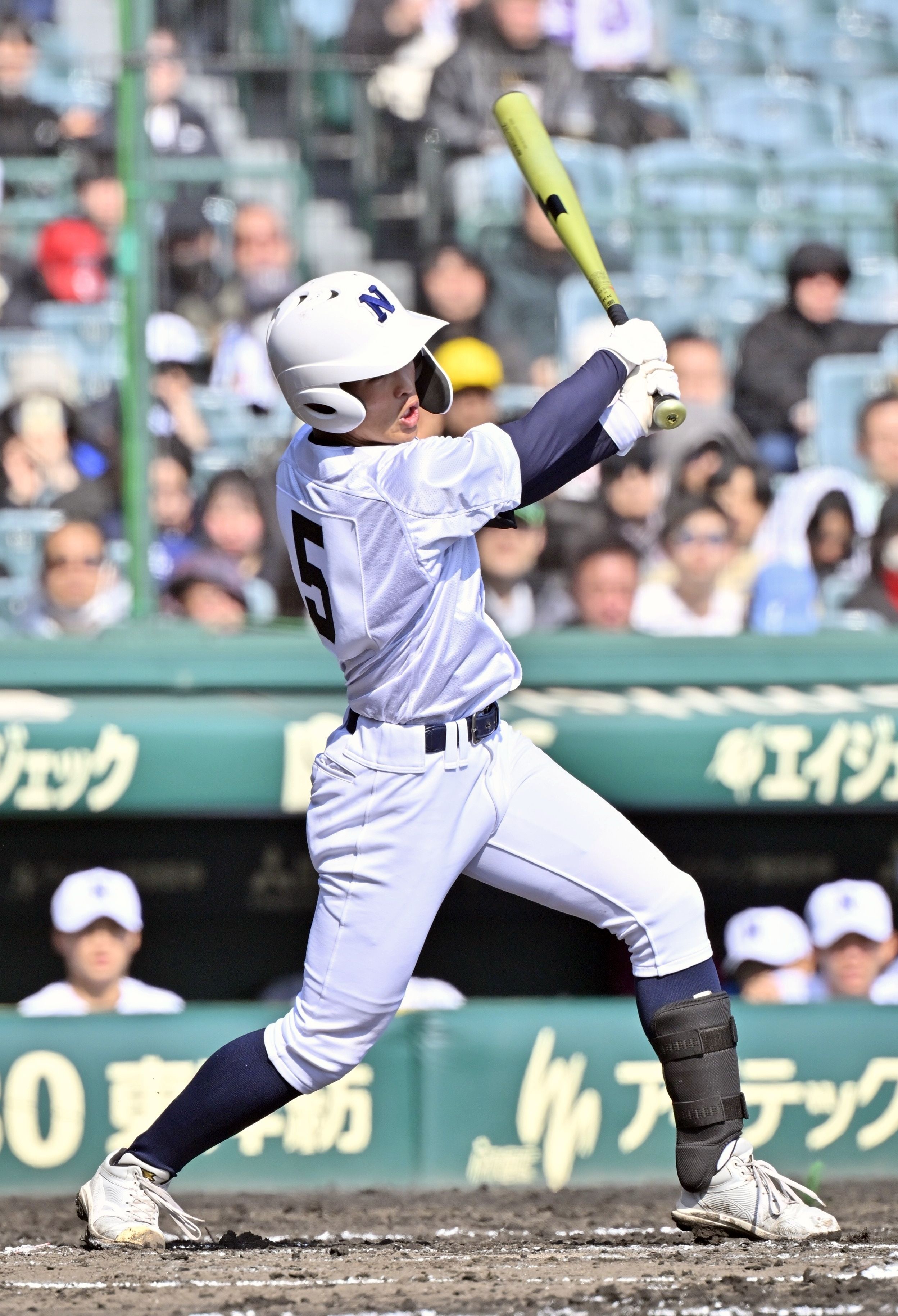 2回、佐野日大の中村が左前打を放つ。この日チームで唯一2安打を放った=甲子園、広瀬華撮影