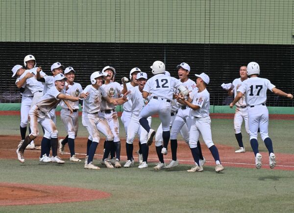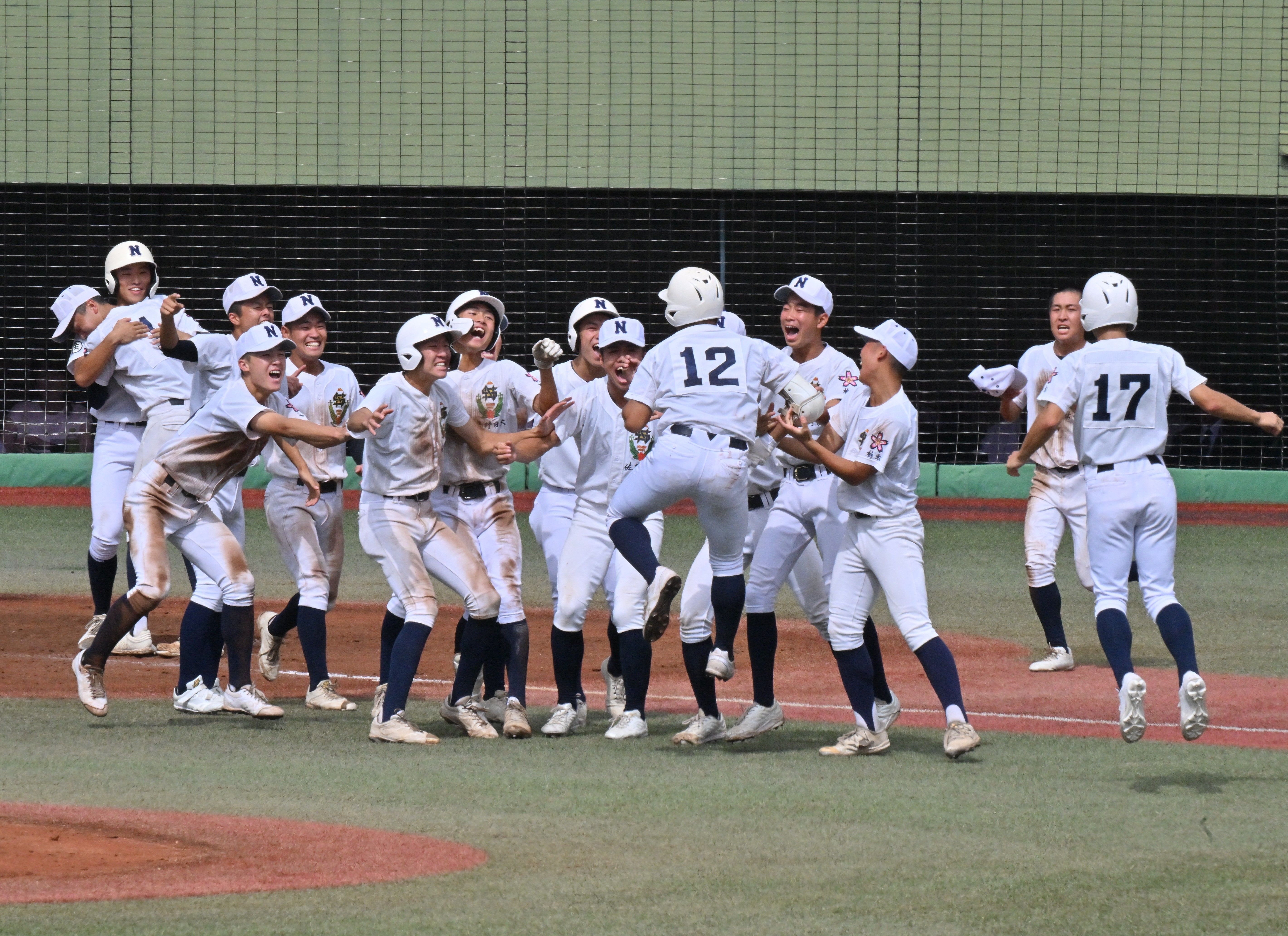 延長10回タイブレークの末、サヨナラ勝ちで2年連続8度目の優勝を果たし、笑顔で集まる佐野日大ナイン=5日午前11時10分、清原球場