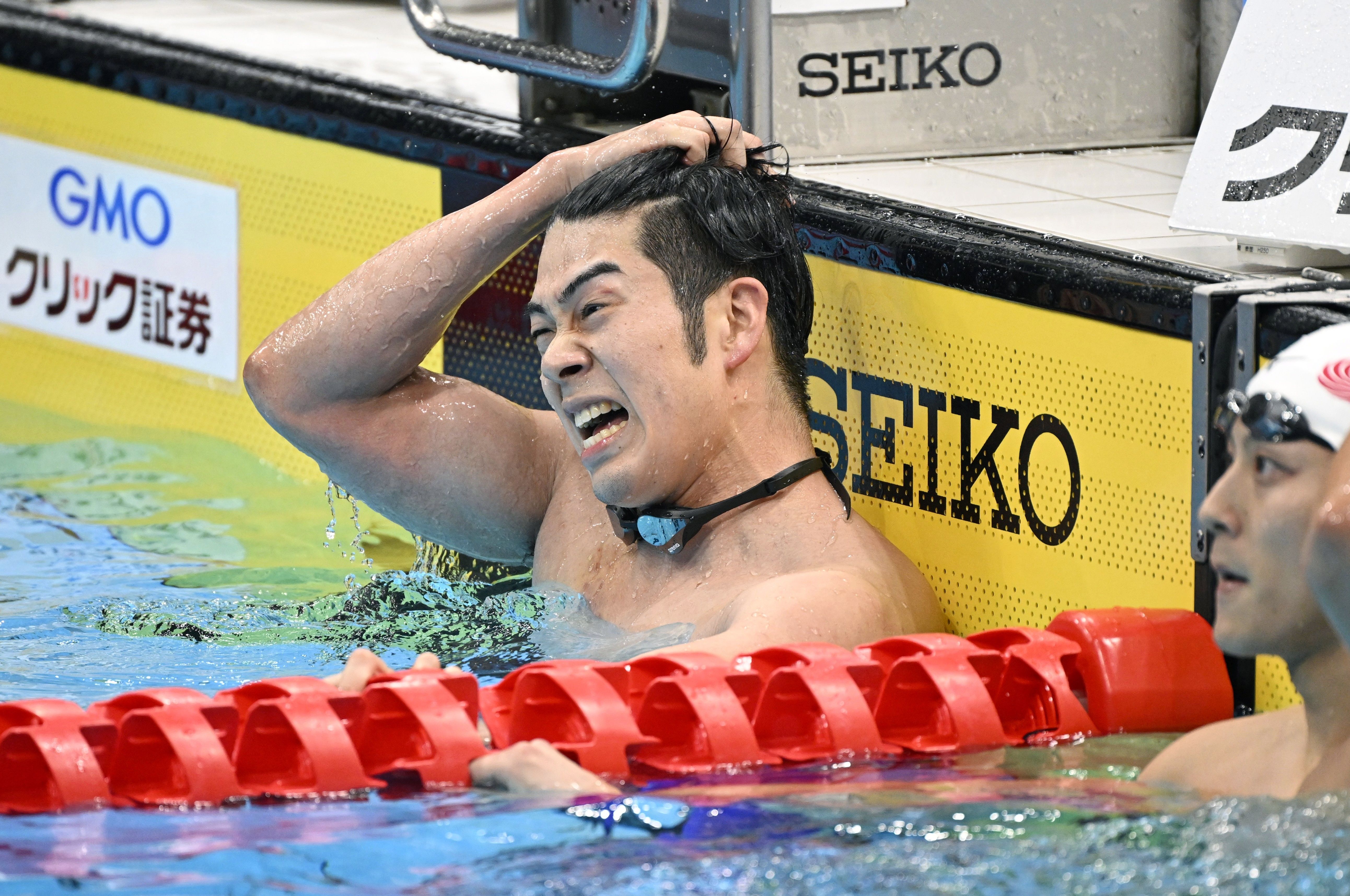 男子100メートルバタフライ決勝 5位となり顔をしかめる水沼(新潟医療福祉大職)=東京アクアティクスセンター、森田大地撮影
