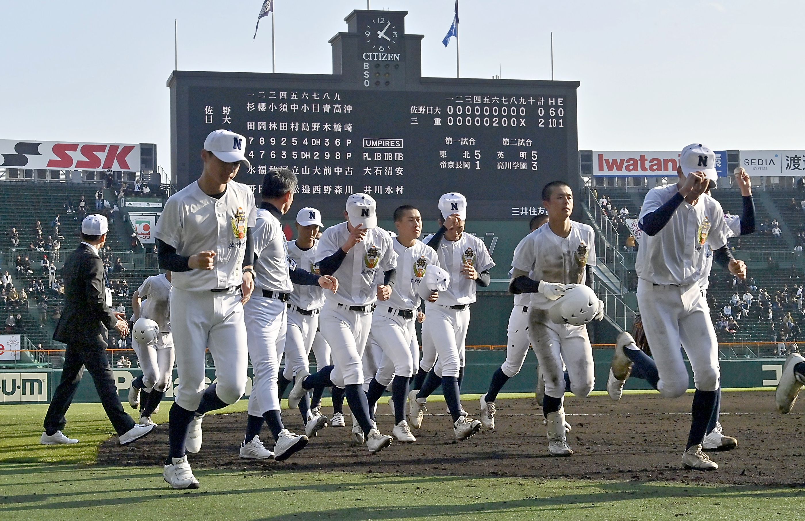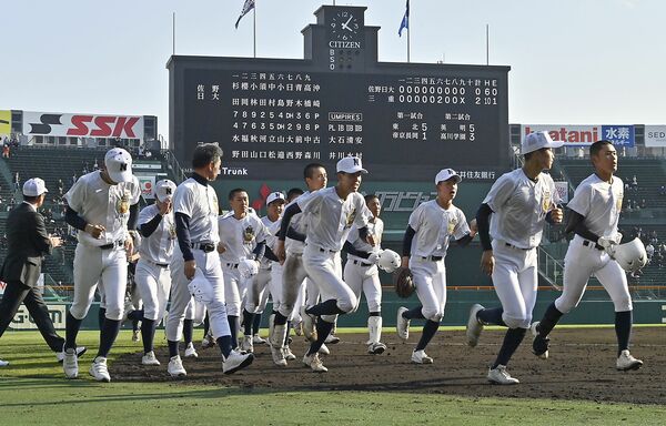 初戦敗退を喫し、悔しさをにじませながらベンチに引き揚げる佐野日大ナイン=23日午後4時5分、阪神甲子園球場