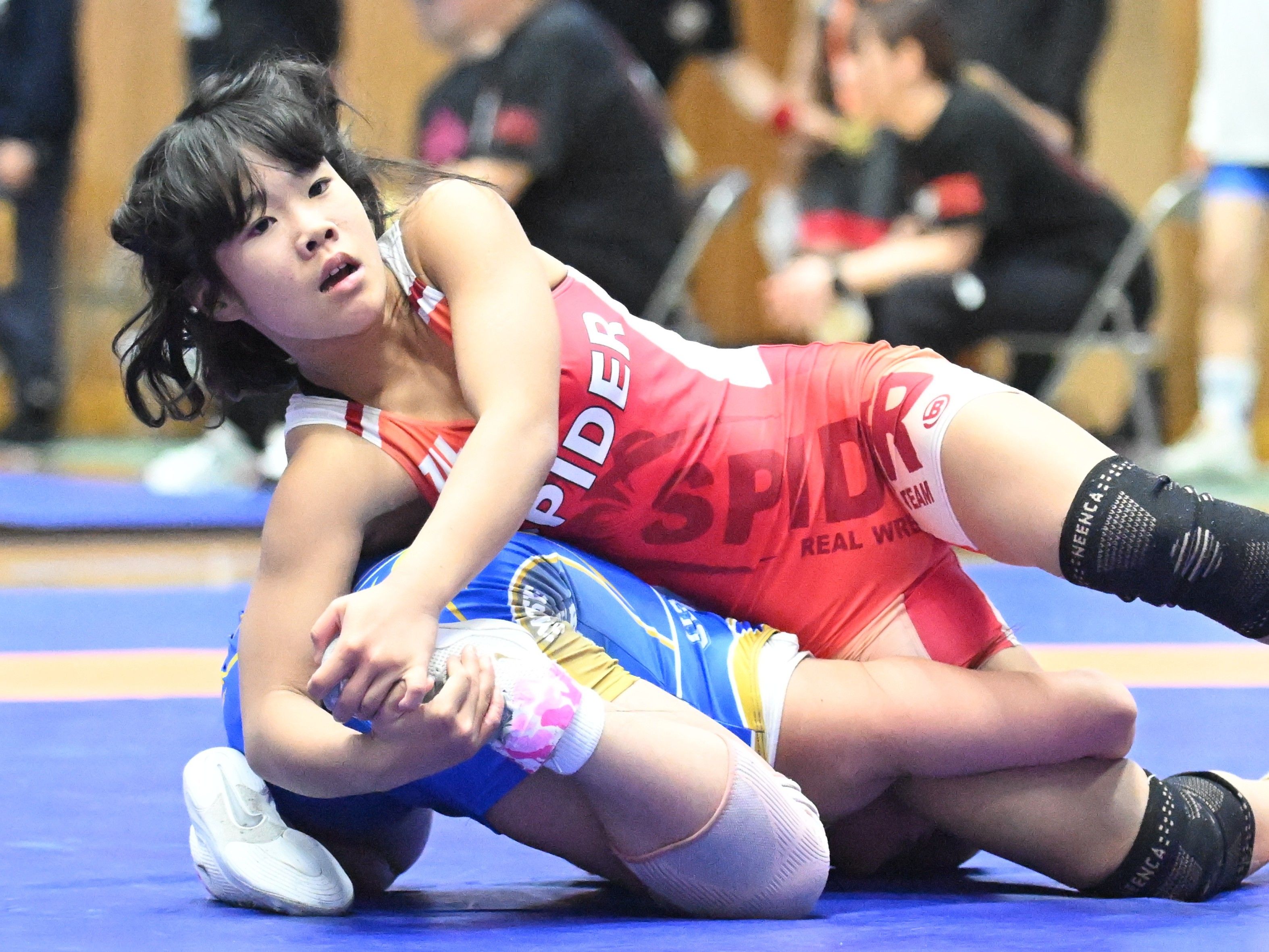 小学女子3、4年37キロ超級決勝 足を取って攻め立てる江泉(SPIDER)=宇都宮市体育館