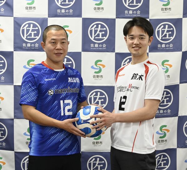 会見で互いに必勝を誓った佐藤法明さん(左)と鈴木大吾さん