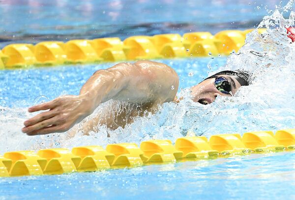 男子200メートル個人メドレー決勝 優勝した松下(東洋大)の自由形=東京アクアティクスセンター、森田大地撮影