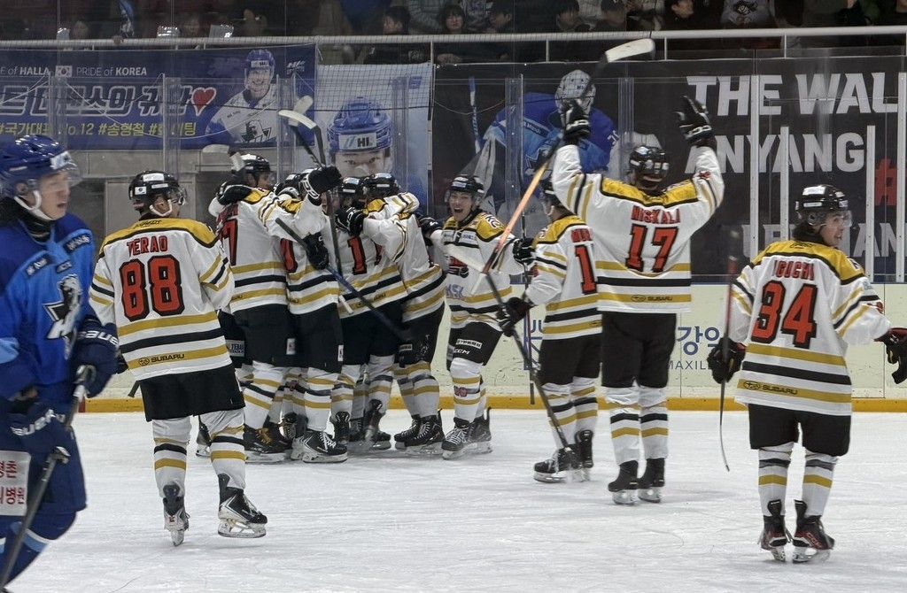 延長戦の末に勝ち歓喜するバックスの選手たち=アニャンアイスリンク