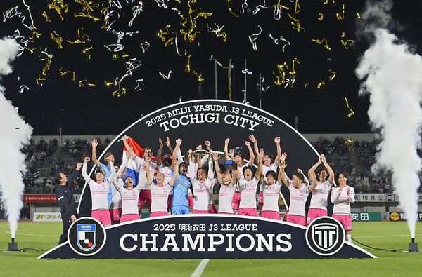 栃木県勢初となるJ3優勝を成し遂げ、セレモニーで歓喜する栃木シティの選手ら=11月29日、相模原ギオンスタジアム