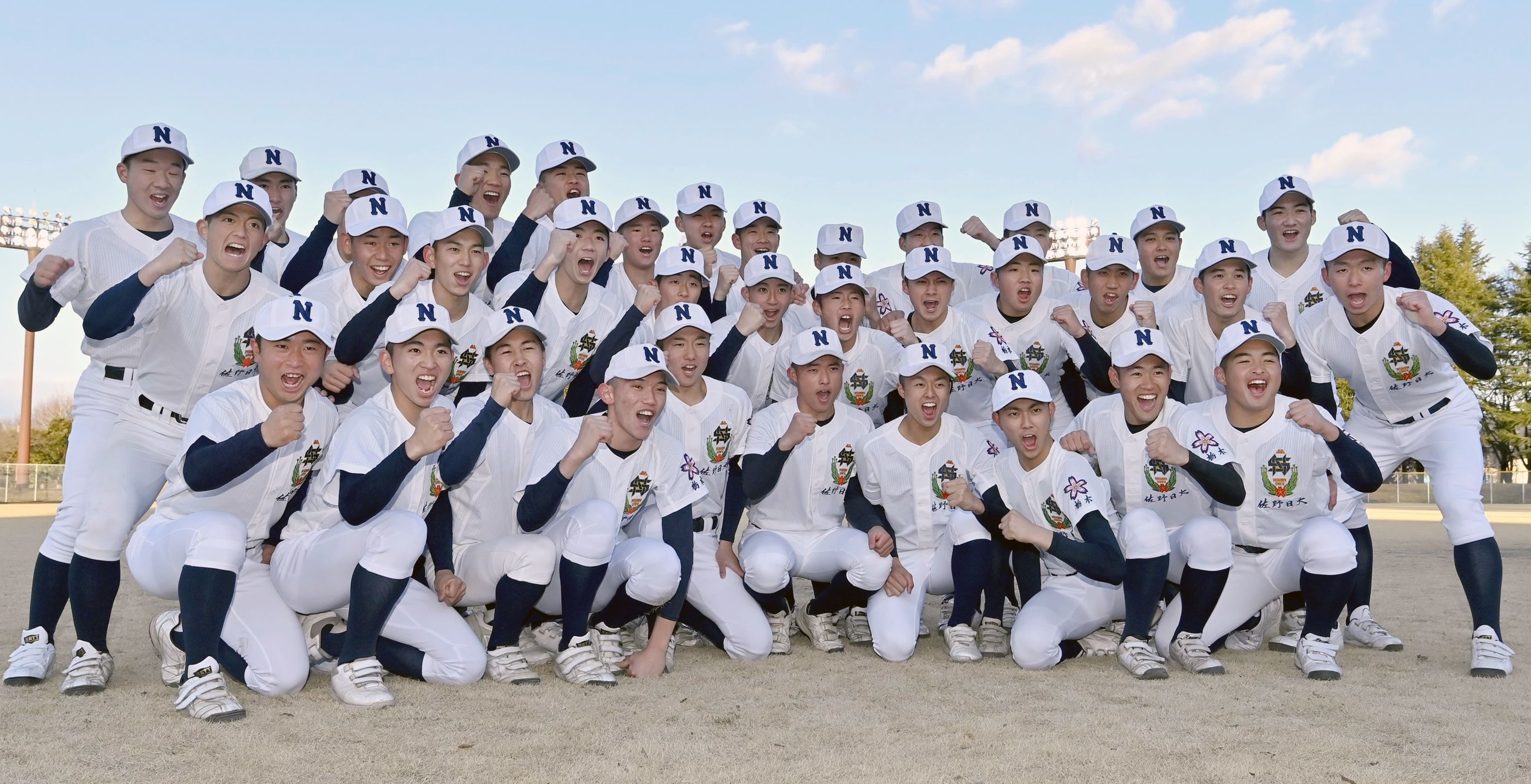 12年ぶり5度目のセンバツ出場を決め、気勢を上げる佐野日大ナイン=1月30日、佐野日大高グラウンド、広瀬華撮影