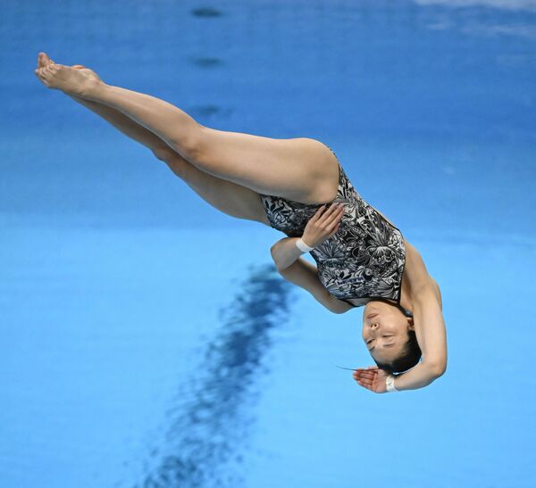 女子3メートル板飛び込み決勝 優勝した榎本(栃木トヨタ)の2回目の演技=東京アクアティクスセンター、森田大地撮影