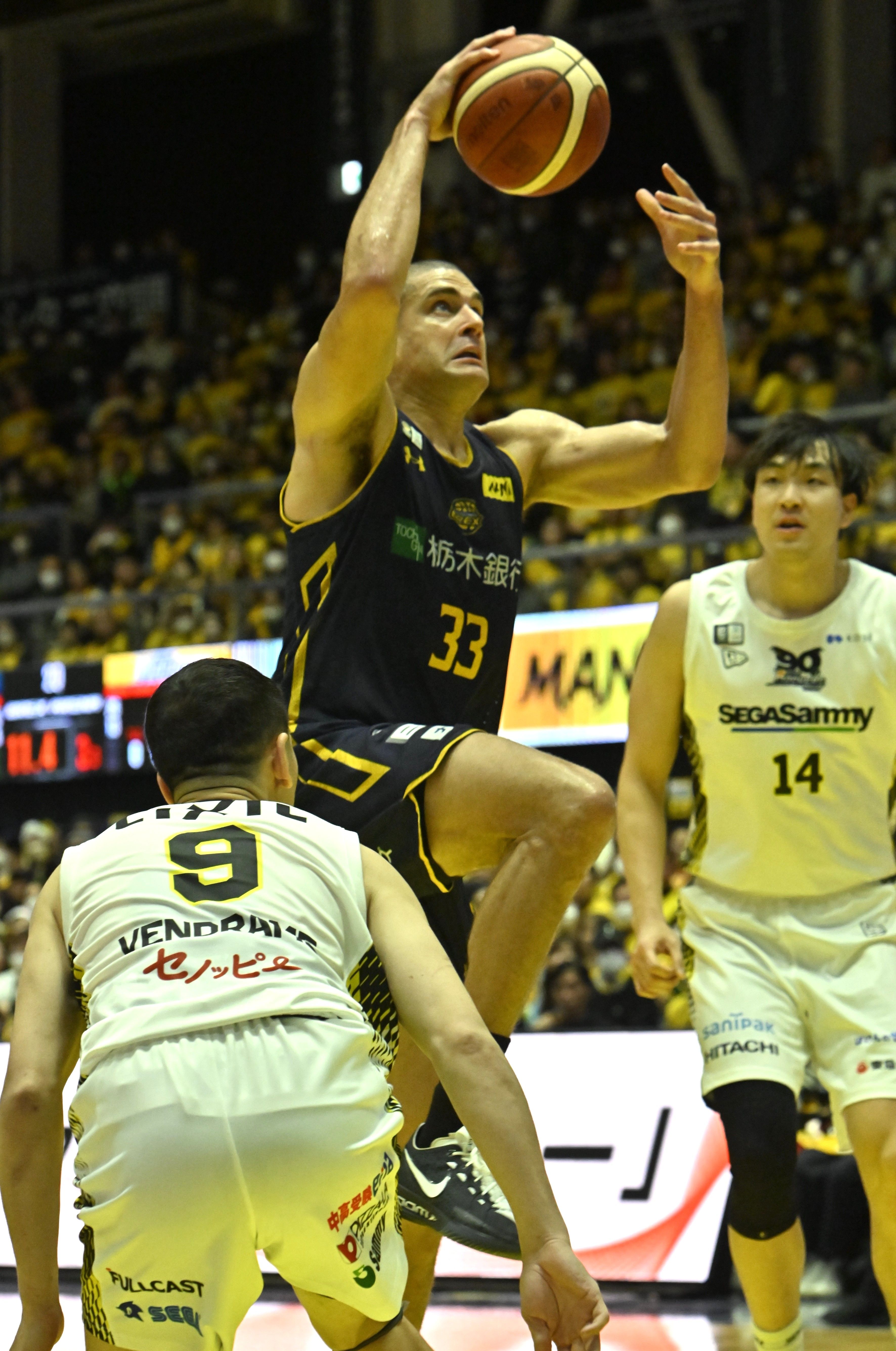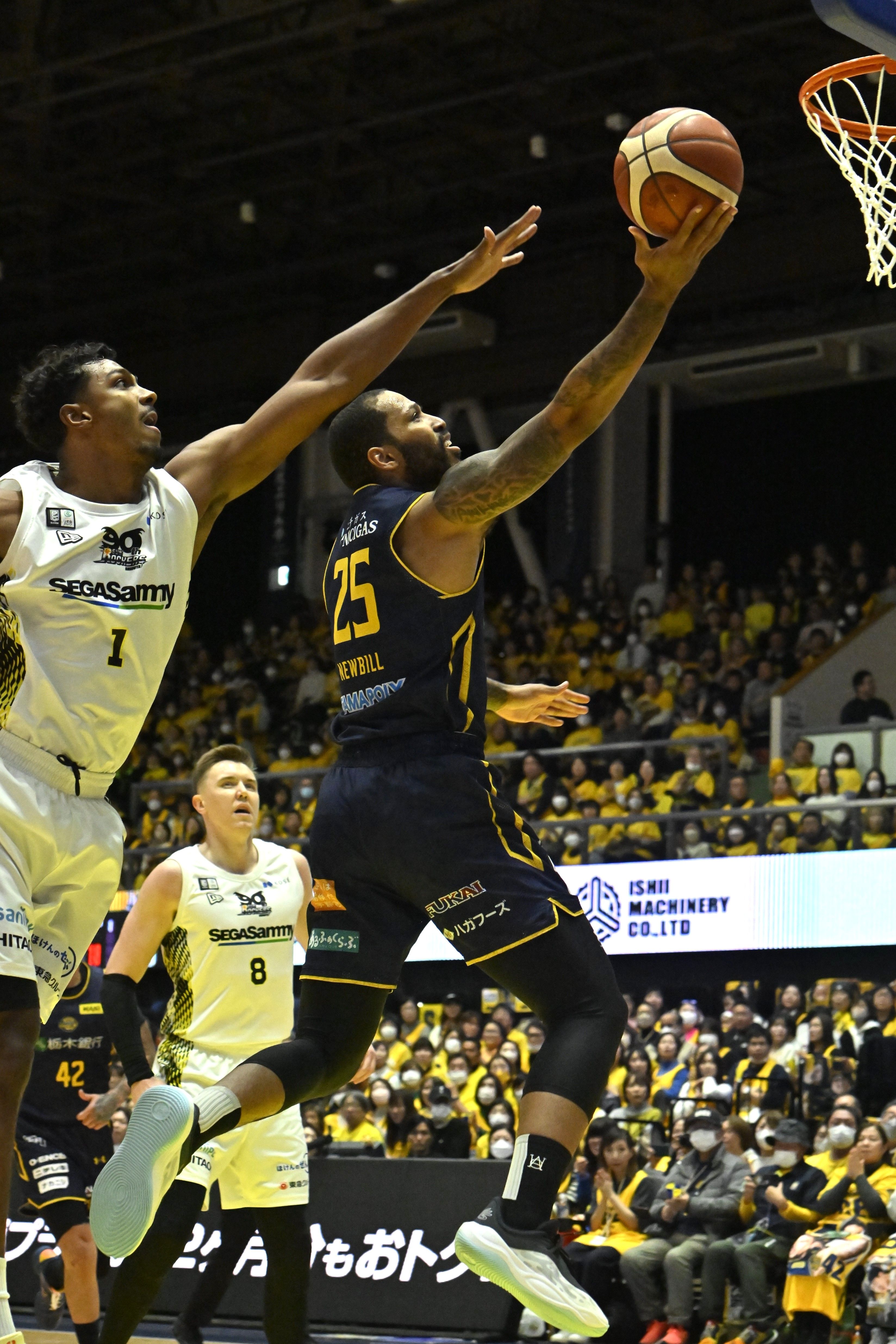 第1クオーター4分、ブレックスのニュービルがブロックをかわしレイアップシュートを決める=ブレックスアリーナ宇都宮、加藤竜矢撮影