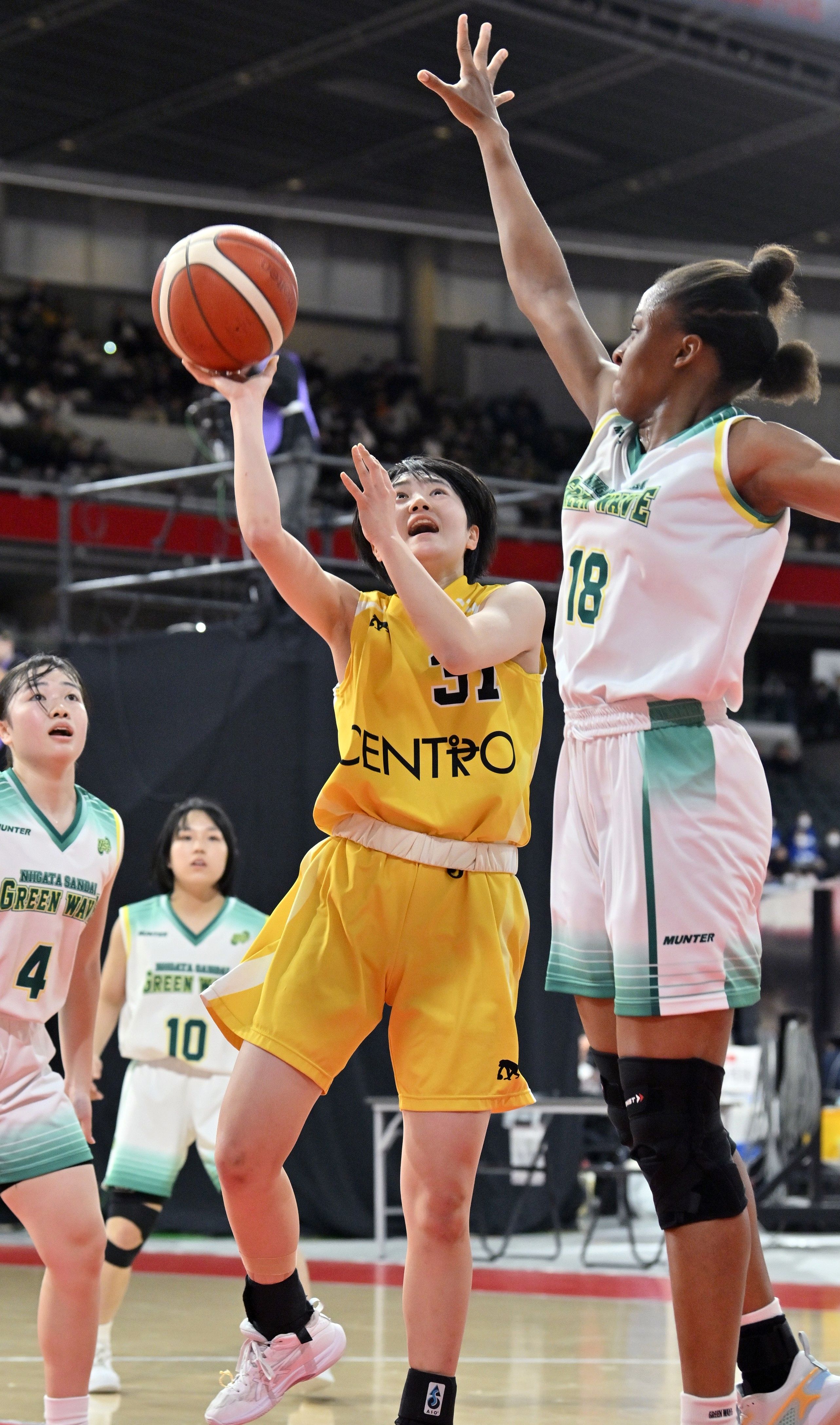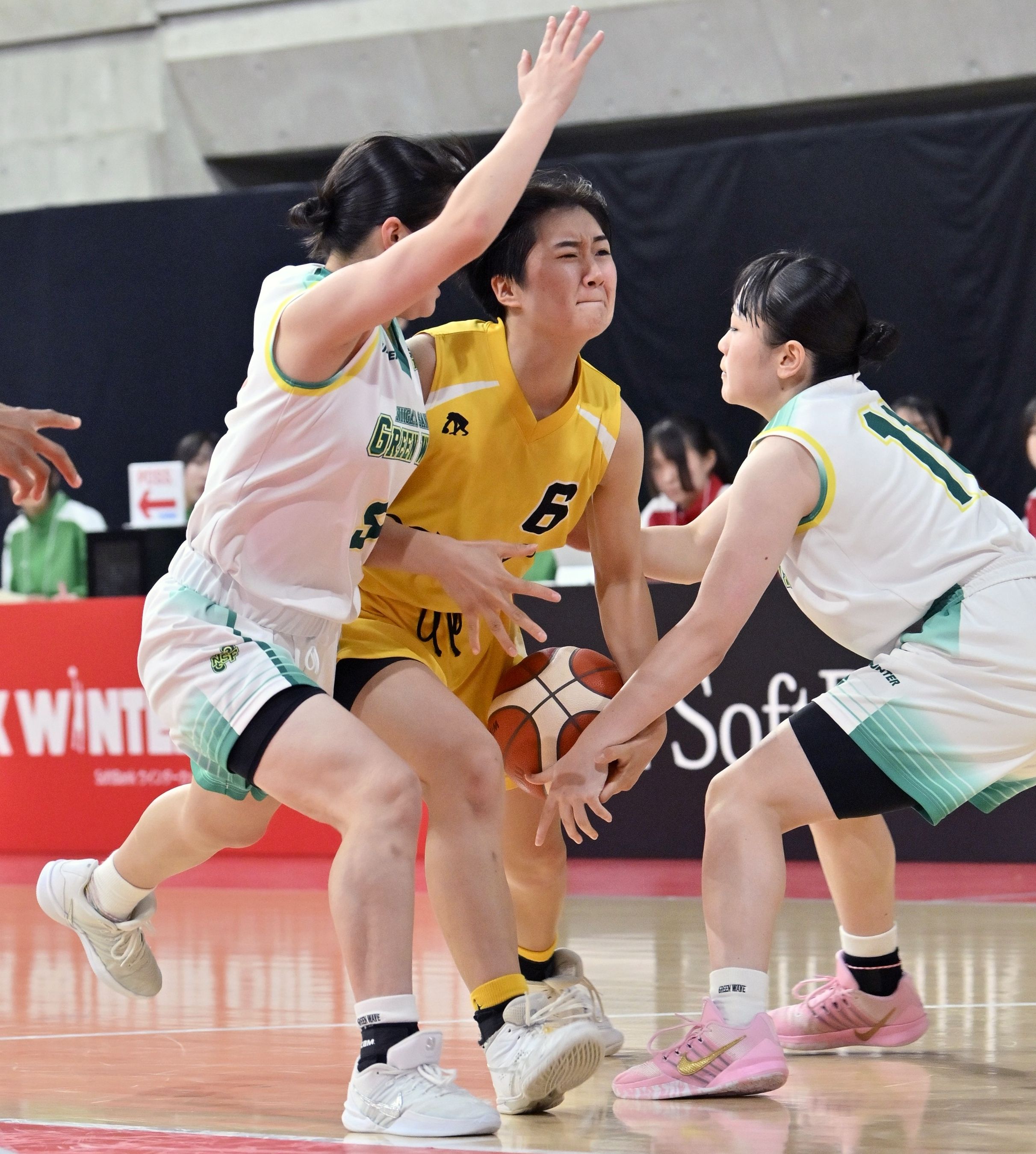 第3クオーター開始直後、矢板中央の阿部(中央)が相手ディフェンスに囲まれながらゴールに攻め込む=東京体育館、広瀬華撮影