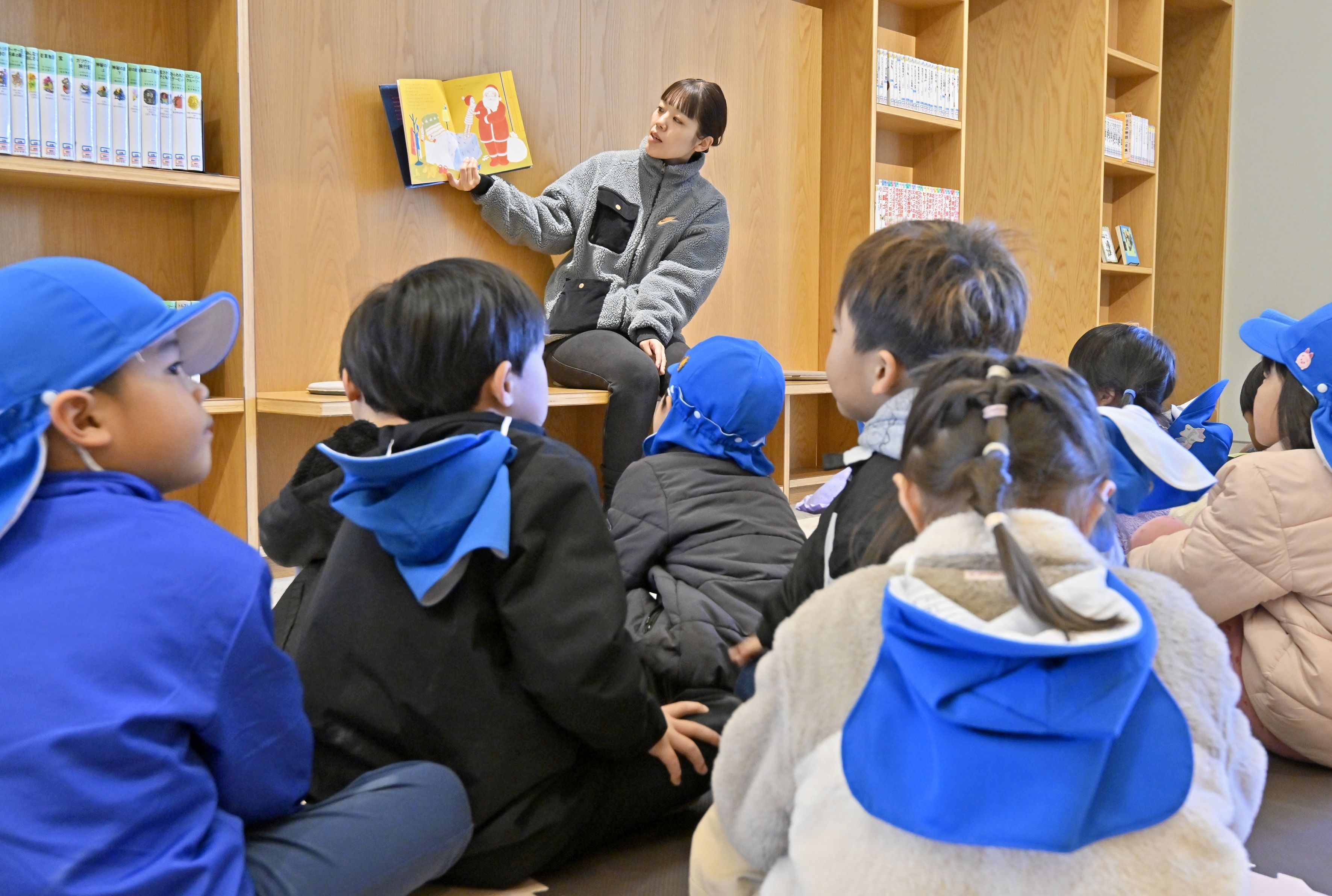 みるるを訪れクリスマスの絵本の読み聞かせに聞き入る園児
