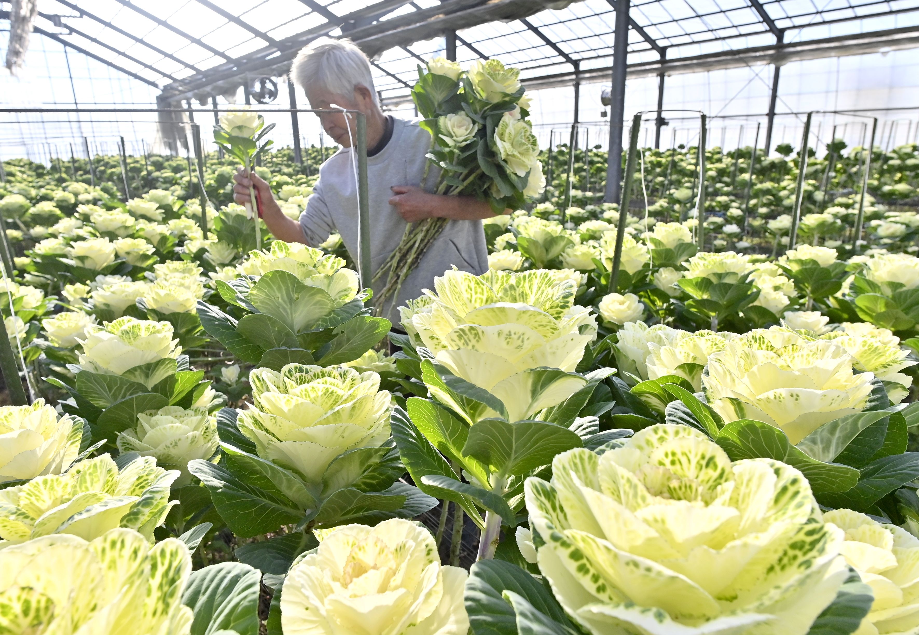 クリスマスや正月を前に収穫作業が大詰めを迎えている葉ボタン=16日午前10時15分、高根沢町平田