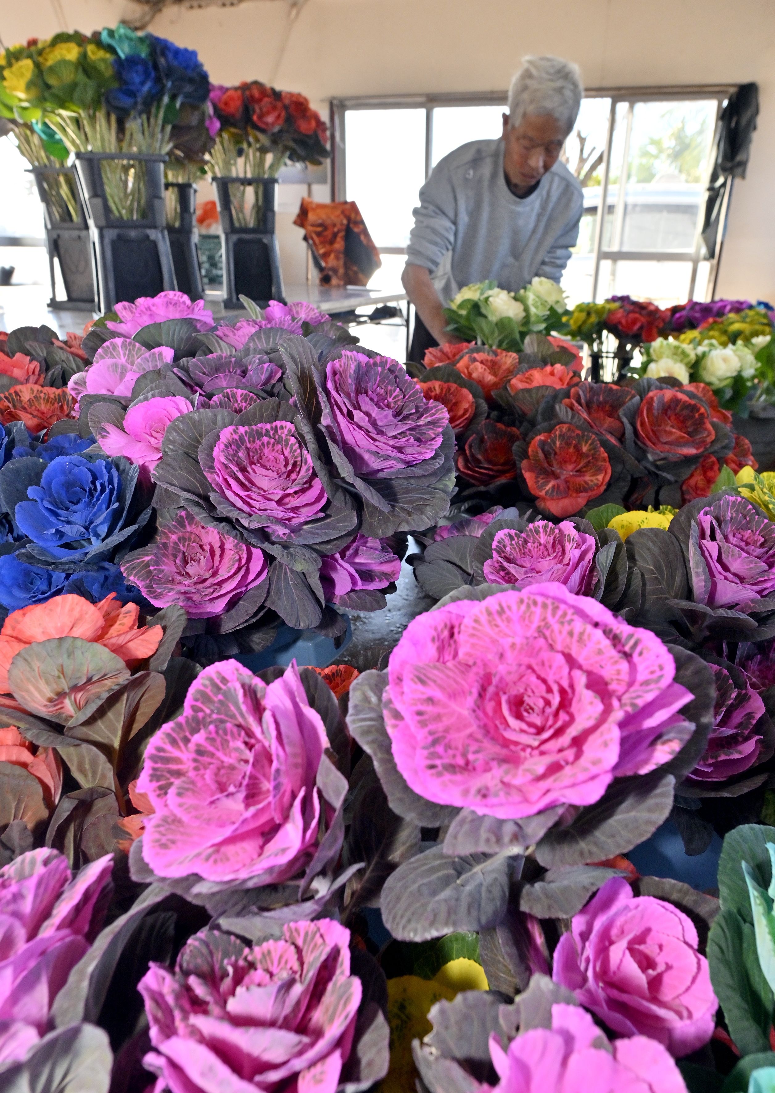 着色料を吸い上げて色鮮やかに染まった葉ボタン=16日午前10時55分、高根沢町平田