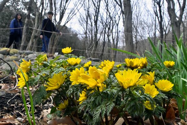 鮮やかに咲くフクジュソウ=26日午後1時、栃木市岩舟町下津原