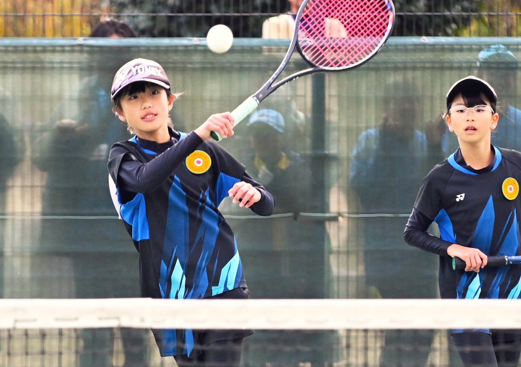 女子5年 笹森・佐藤組(BC-F)-矢田部・平久組(野木)決勝 第3ゲーム、佐藤がレシーブ。右奥は笹森=丸山公園