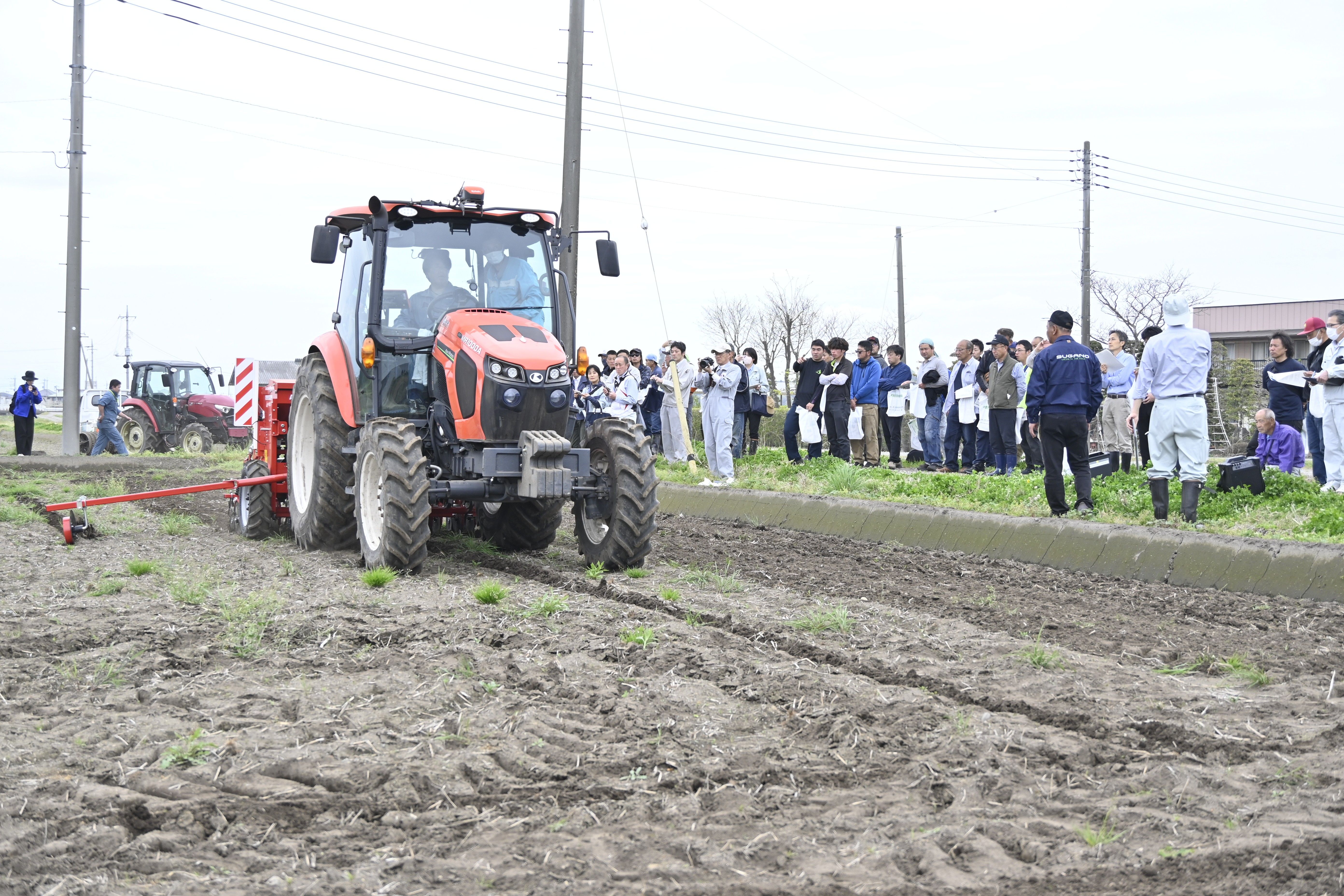 県塩谷南那須農業振興事務所が開いた水稲乾田直播栽培の実演会=15日午後、高根沢町