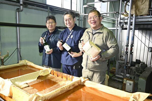 日光醤油「誉」作りに連携した渡辺社長(左)と樋山社長(中央)、八木澤代表