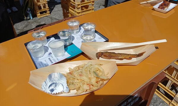 筆者が頼んだ有料試飲セットとアユの甘露煮など=4月11日、那須烏山市