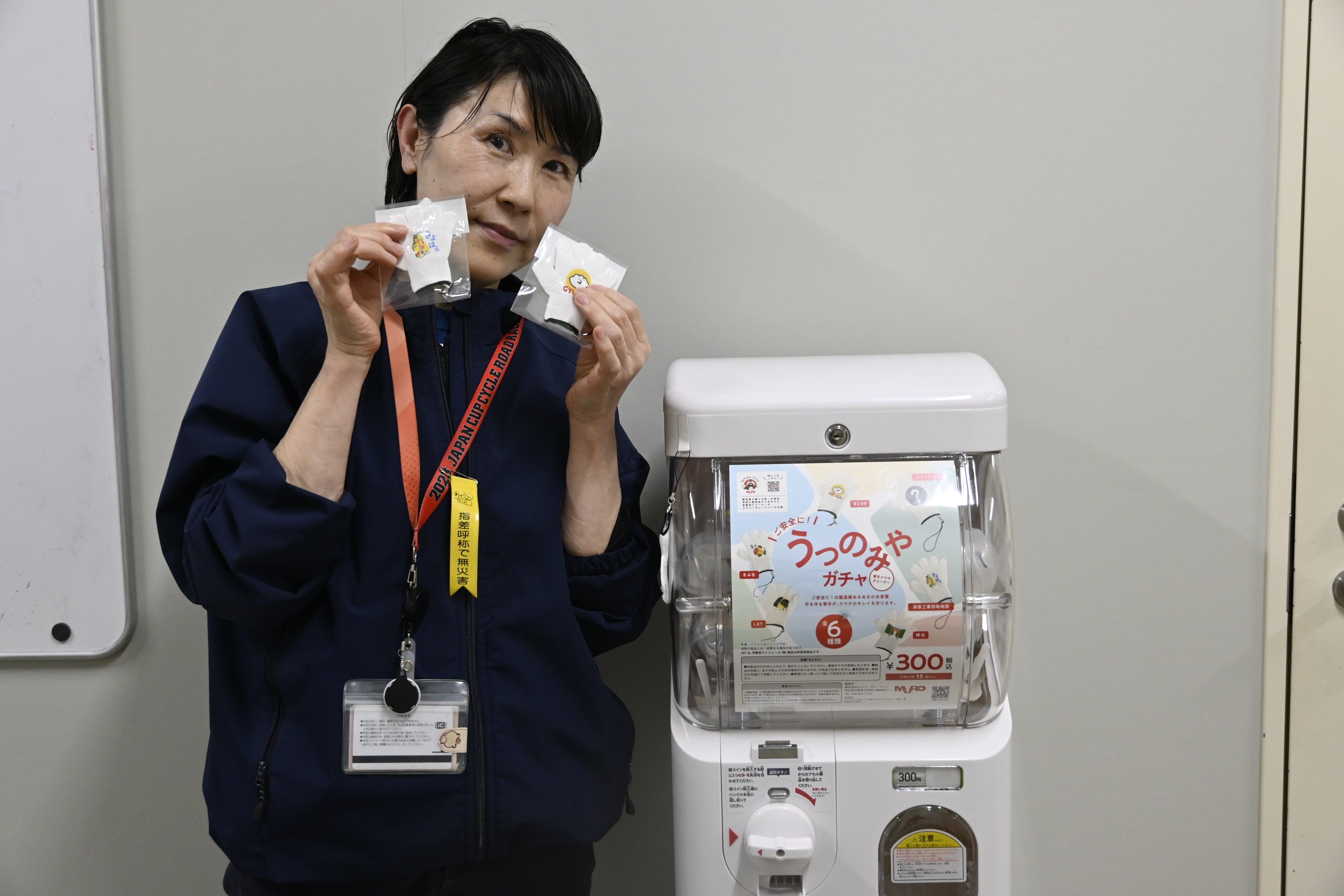 「ご安全に!うつのみやガチャ」をPRする市岡スーパーバイザー=4月中旬、宇都宮市