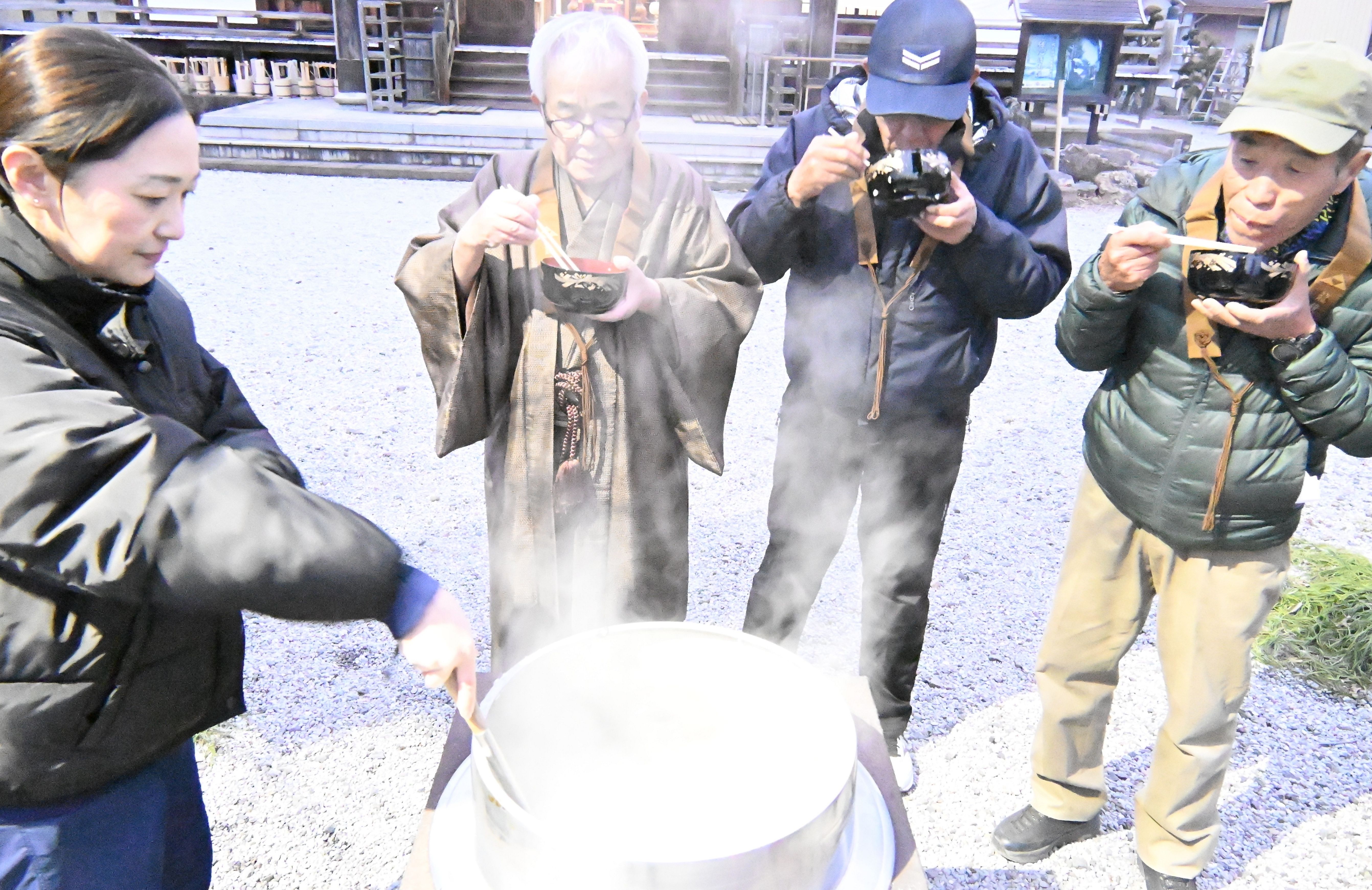 七草がゆを味わう檀家ら