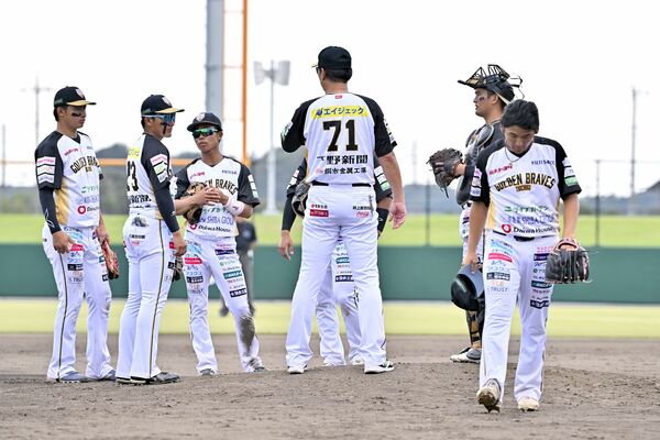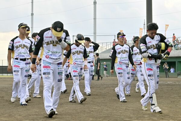 2年連続の準優勝に終わり、肩を落としてベンチに引き揚げる栃木GBの選手たち=真岡ハイトラ運動公園市民球場、広瀬華撮影