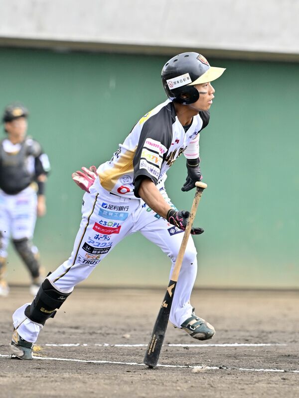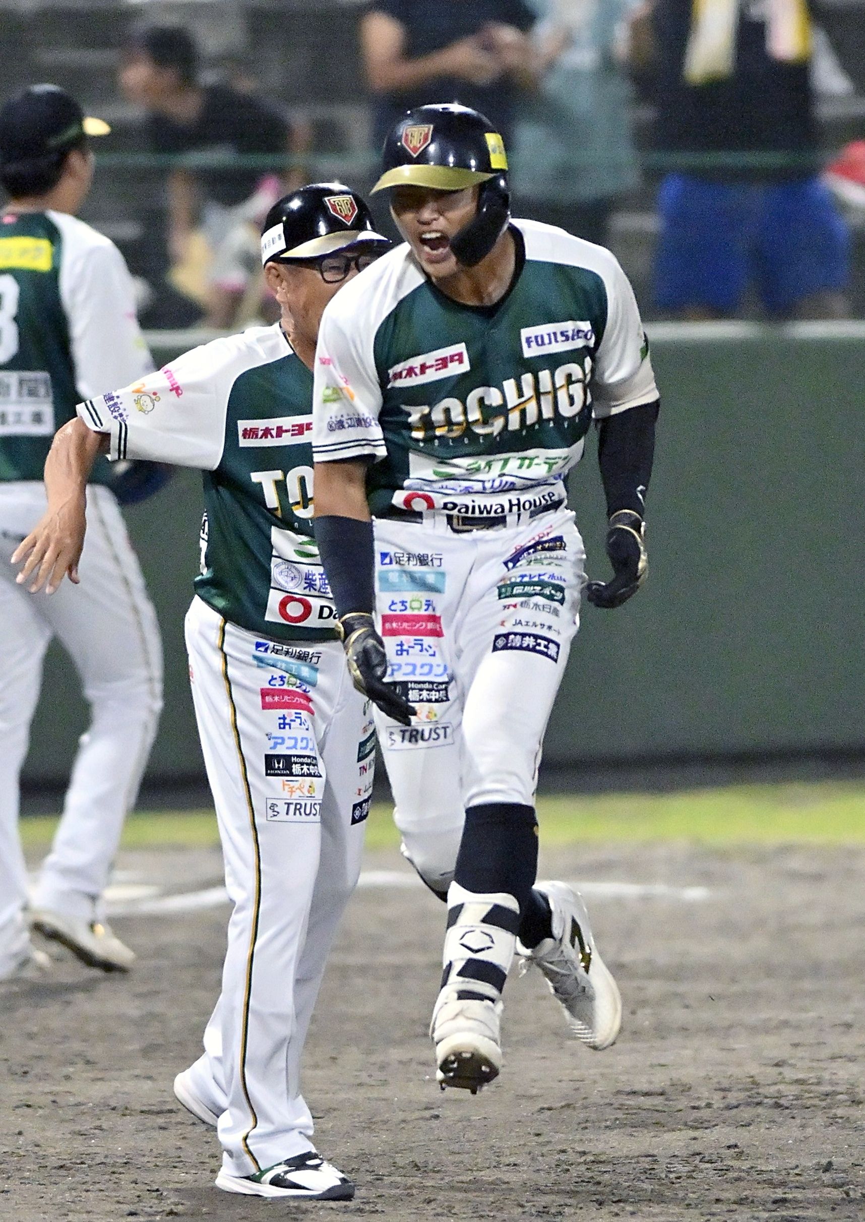 7回、栃木GBの三方が逆転となる3点本塁打を放ち、雄たけびを上げる