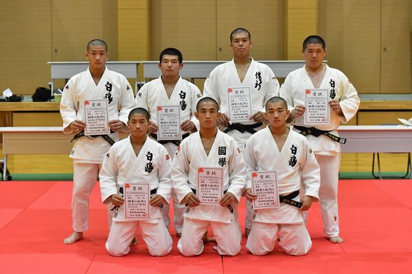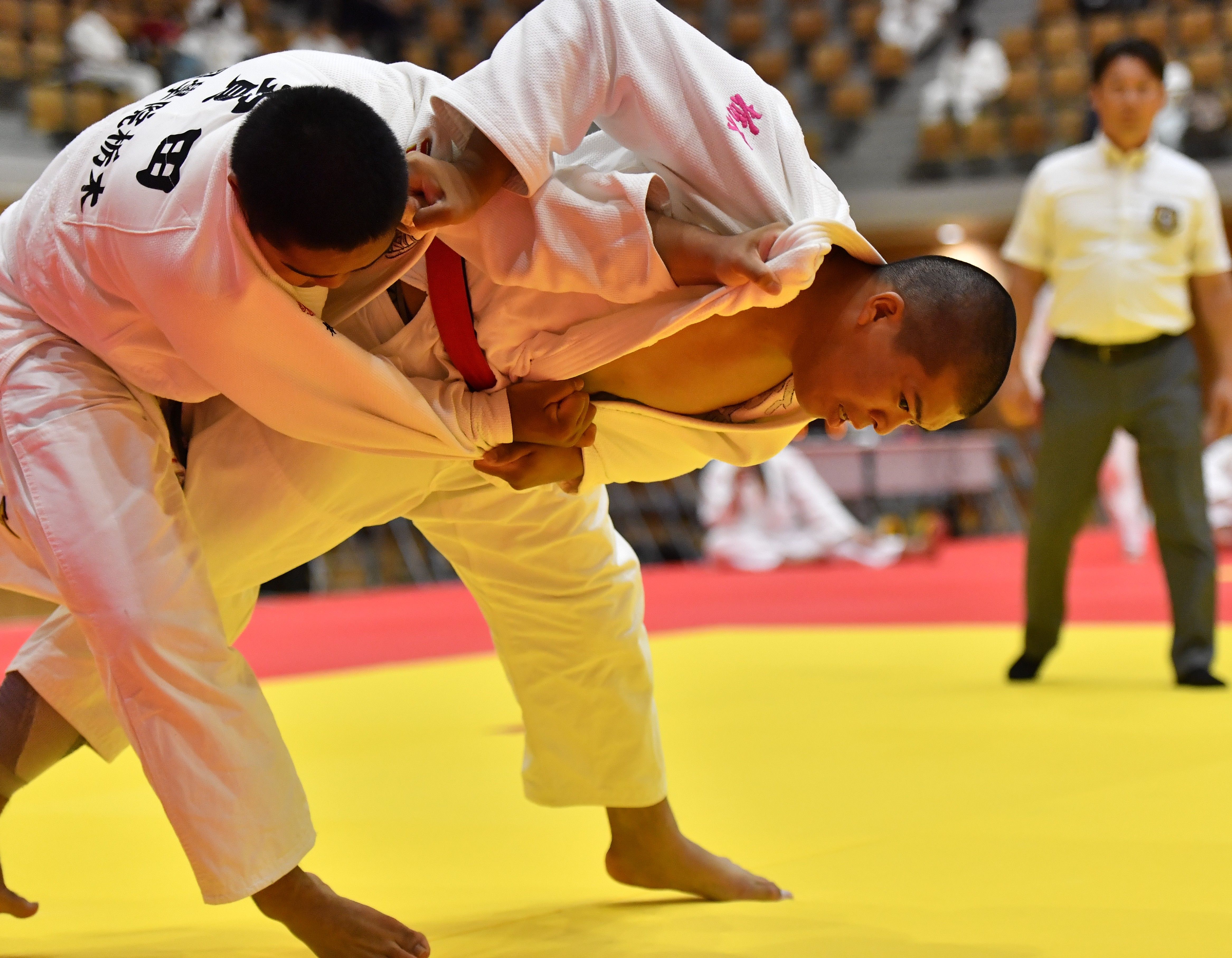 男子100キロ級決勝 内股を仕掛ける作新の中村(右)=ユウケイ武道館、湯田大士撮影