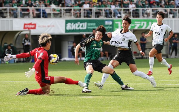 後半、ゴール前で守備をする栃木SCのGK川田(左)ら=サンプロアルウィン