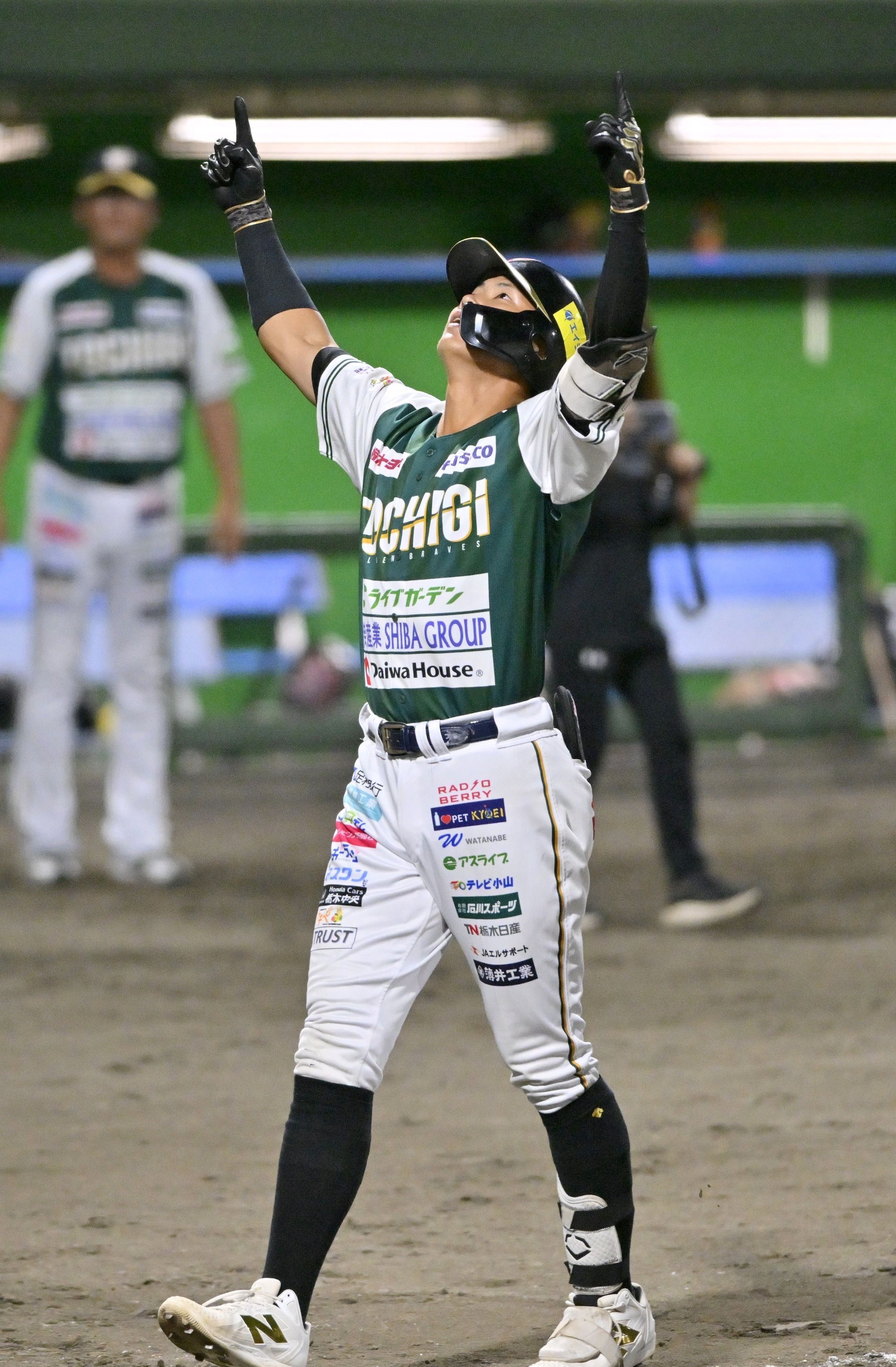7回、栃木GBの三方が逆転となる3点本塁打を放ち、天を仰ぐ=小山運動公園野球場、広瀬華撮影