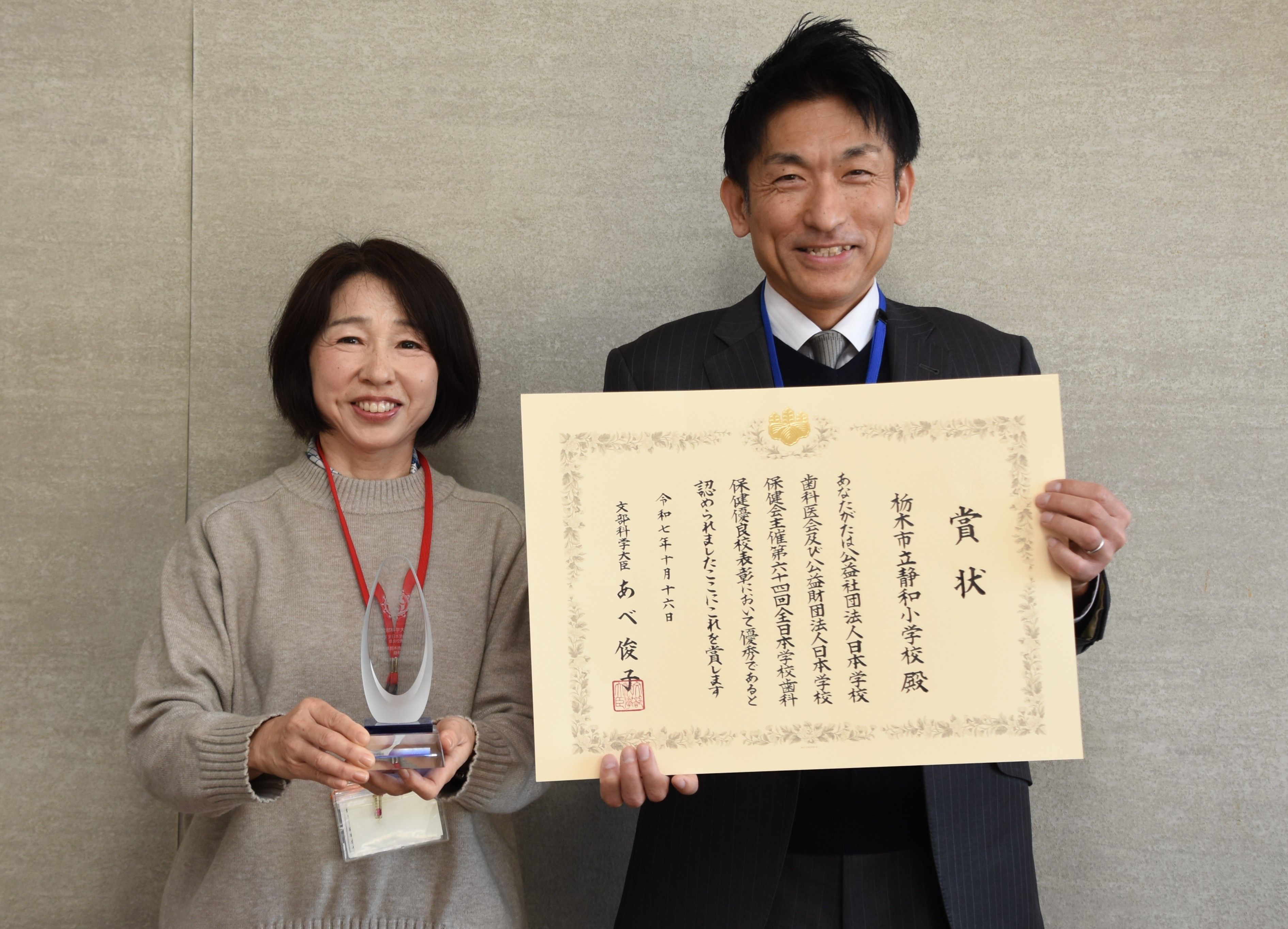 歯の健康を守る取り組みで最高賞を受賞した静和小の柿沼校長(右)と渡辺養護教諭