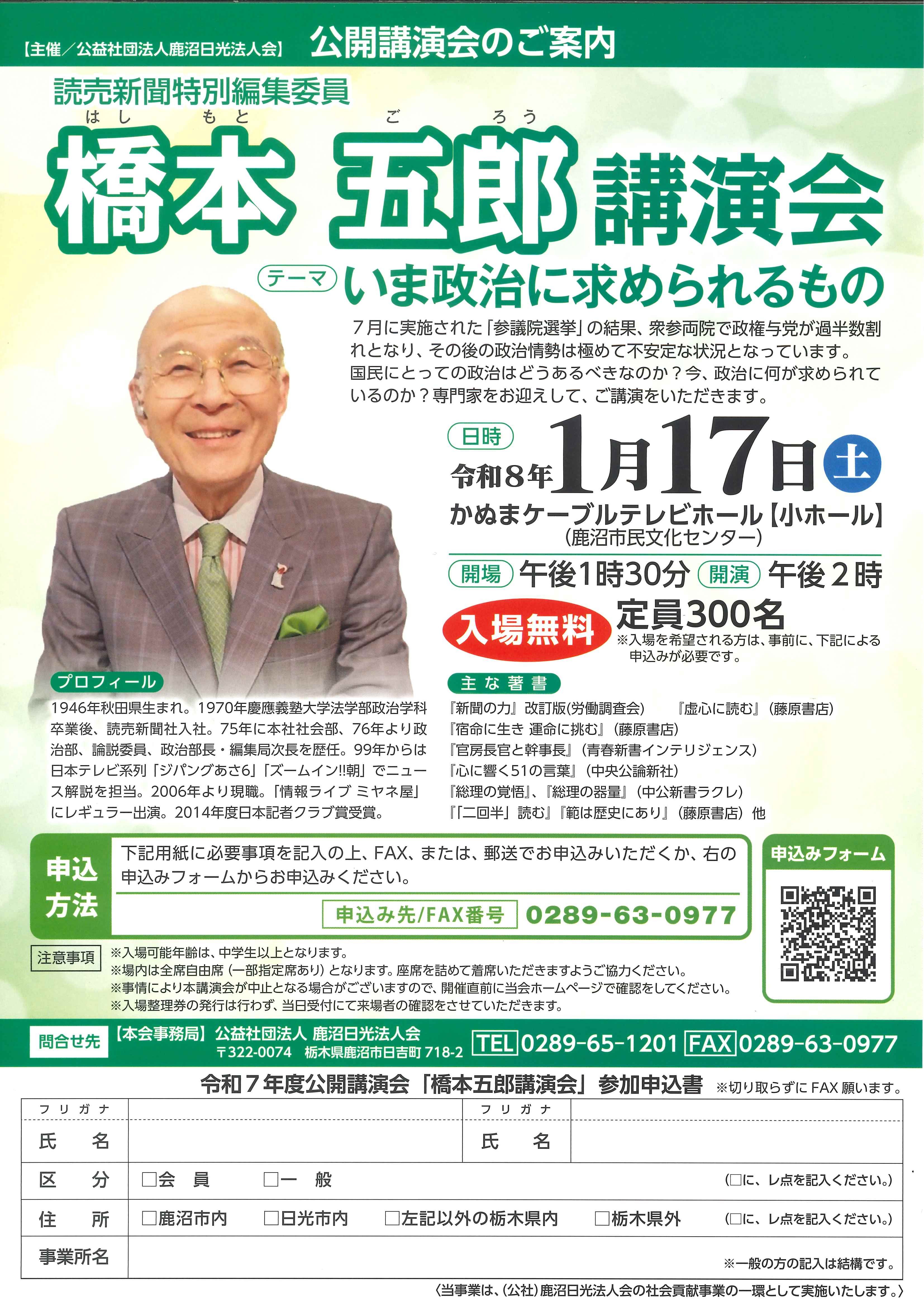 橋本五郎さんを講師に招く公開講演会のチラシ