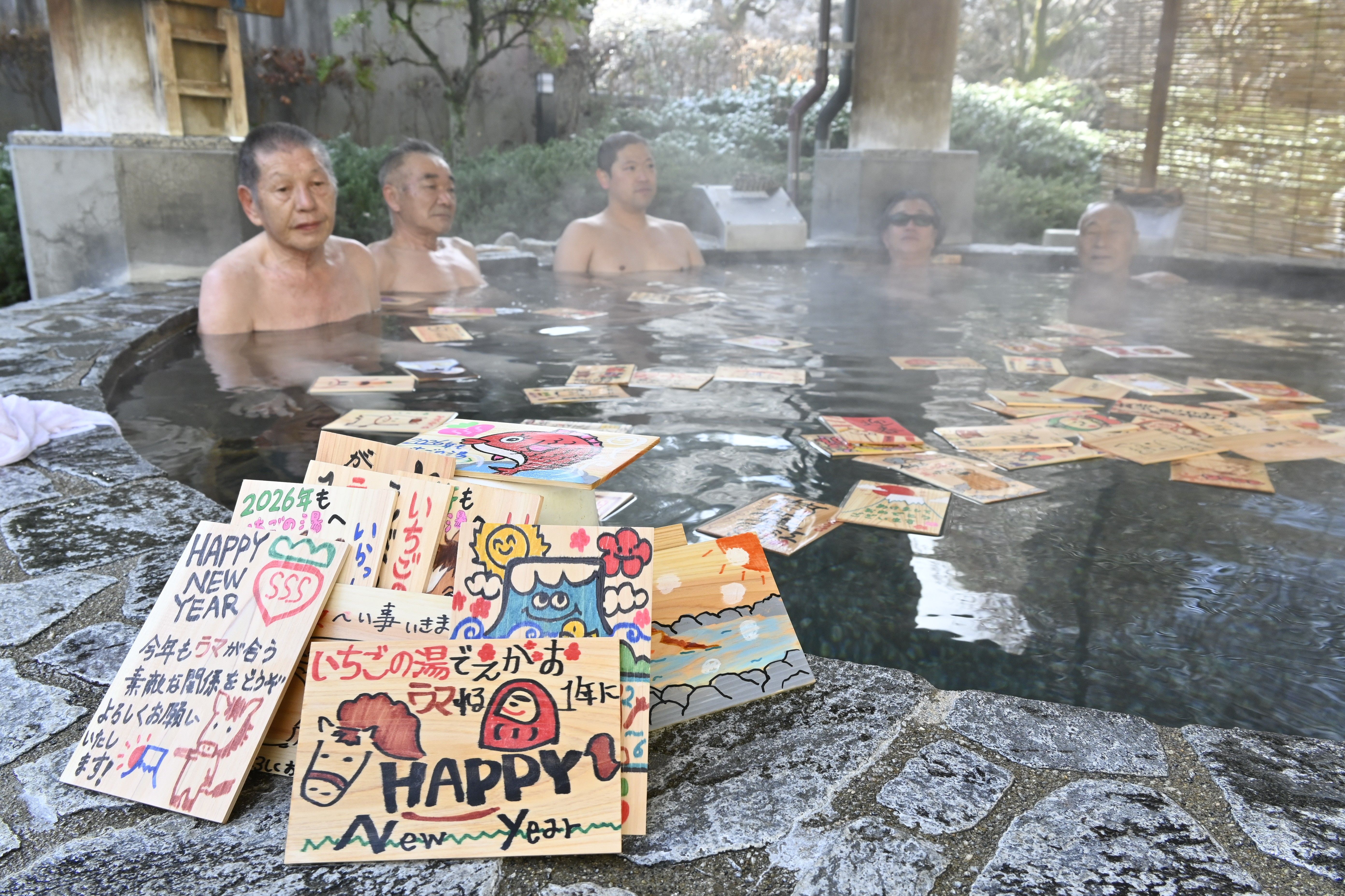 「年賀状風呂」で新年あいさつ 真岡・おふろcafeとさくら・お丸山ホテルで12日まで