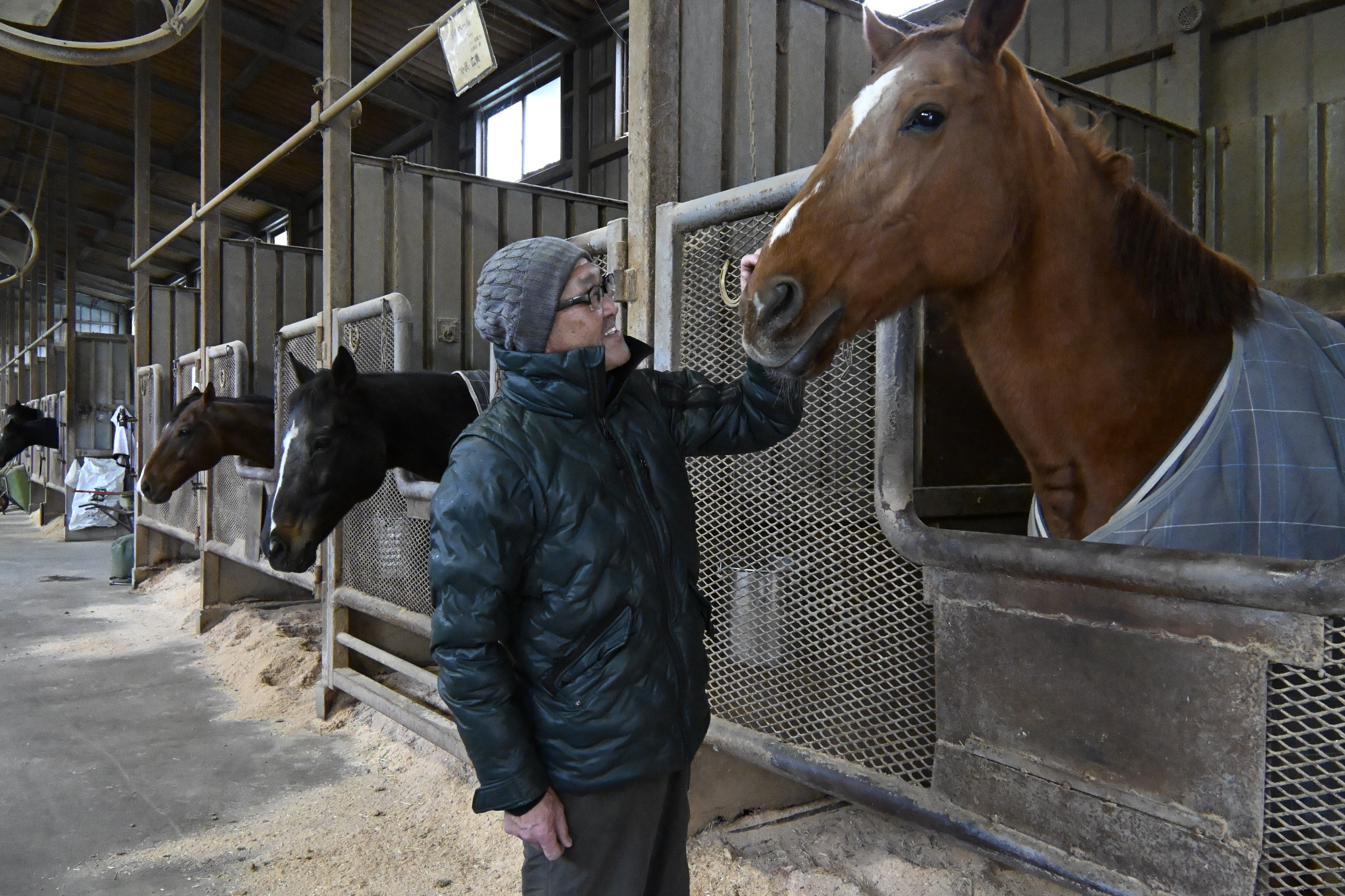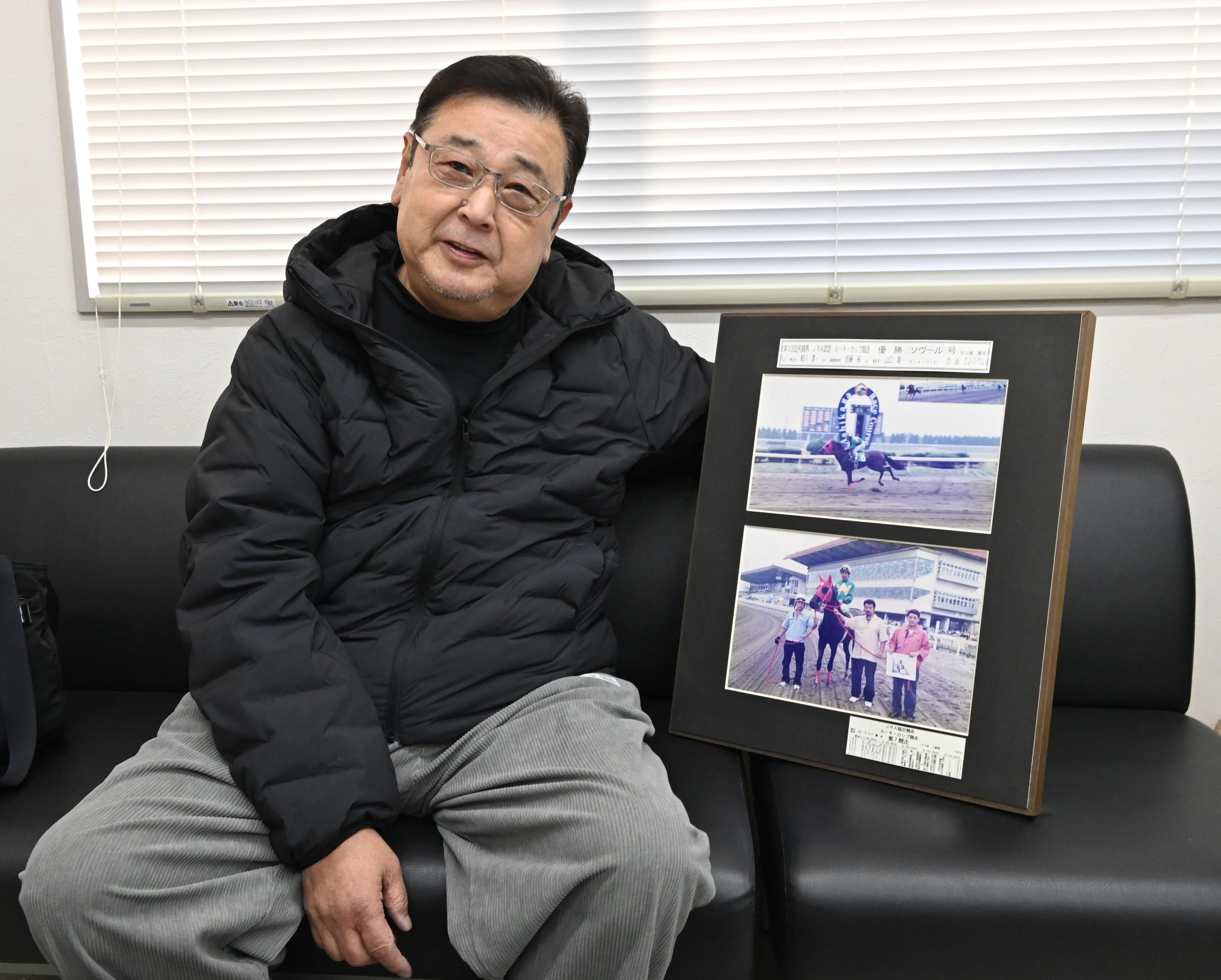 厩舎の馬が優勝した当時の写真を手に思い出を振り返る佐藤さん