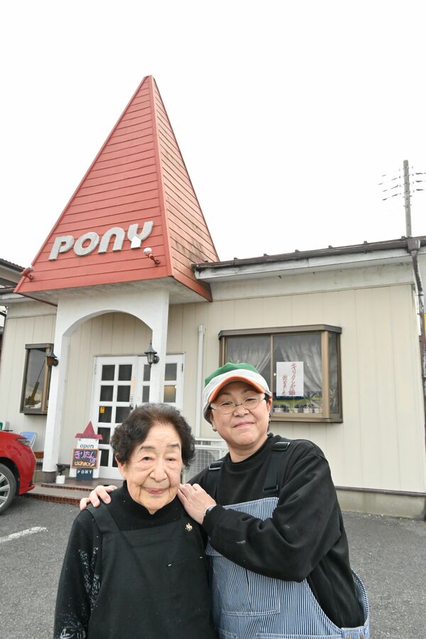 喫茶店「PONY」の前に立つ下村さん(左)と関口さん
