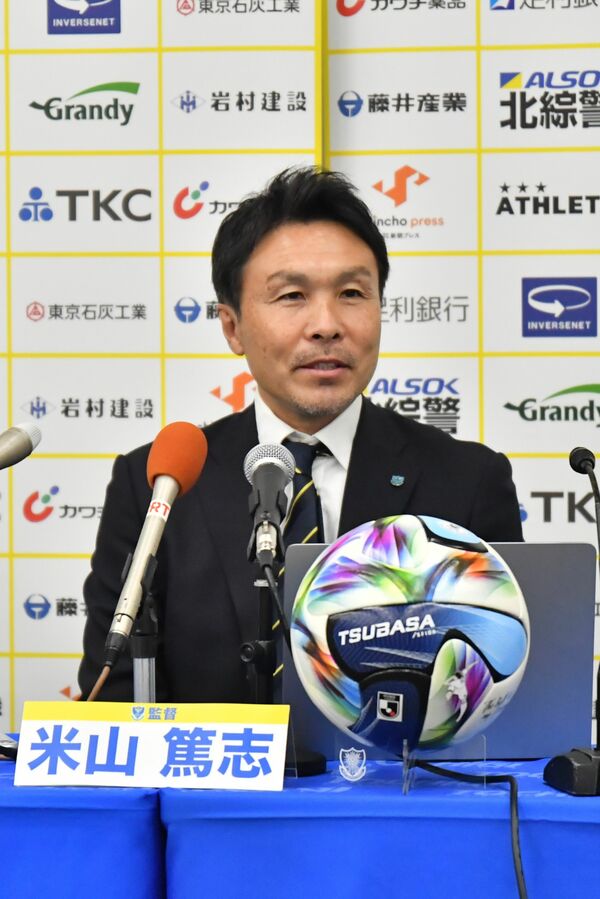 就任会見で意気込みを語る栃木SCの米山新監督=県庁記者クラブ、鈴木航撮影