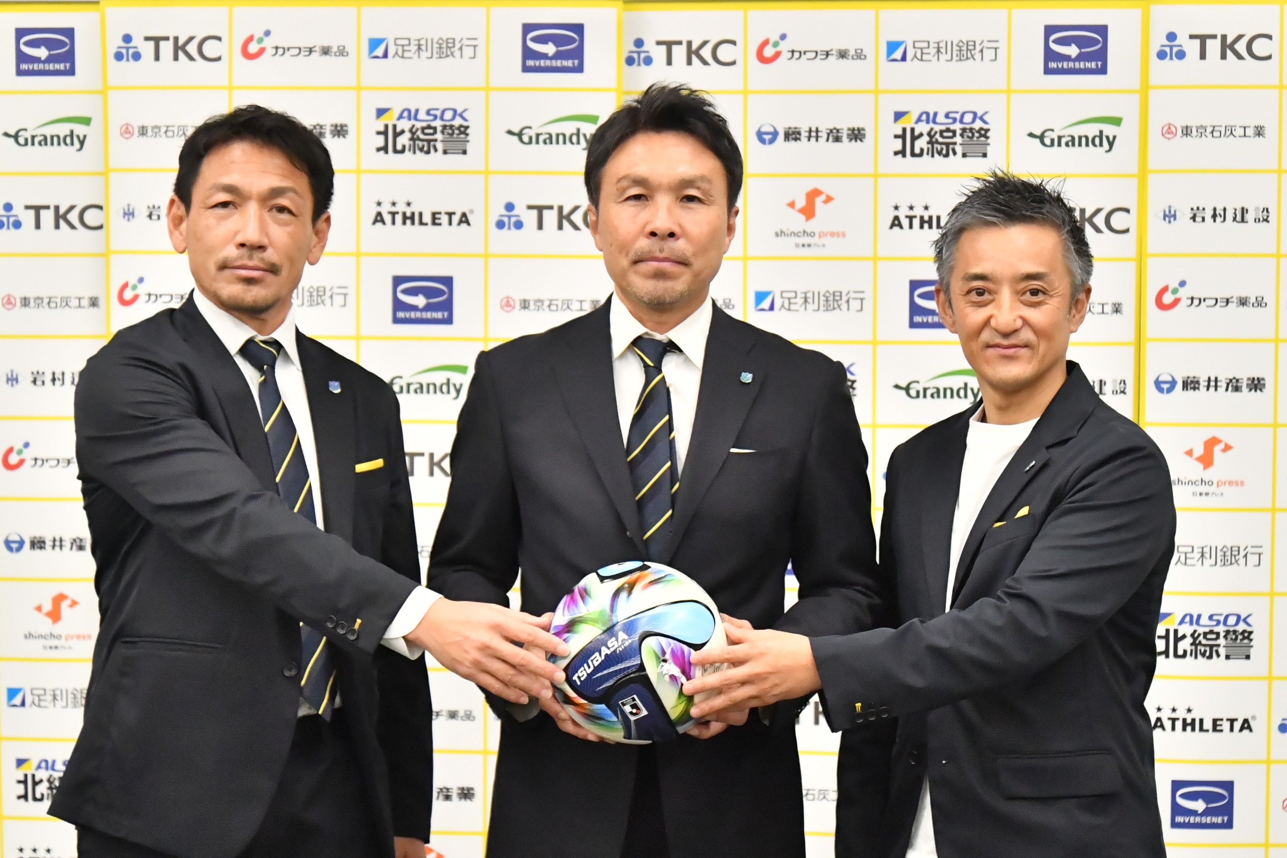 橋本社長(右)、谷池強化部長(左)と記者会見に臨んだ米山新監督=22日午後、県庁記者クラブ