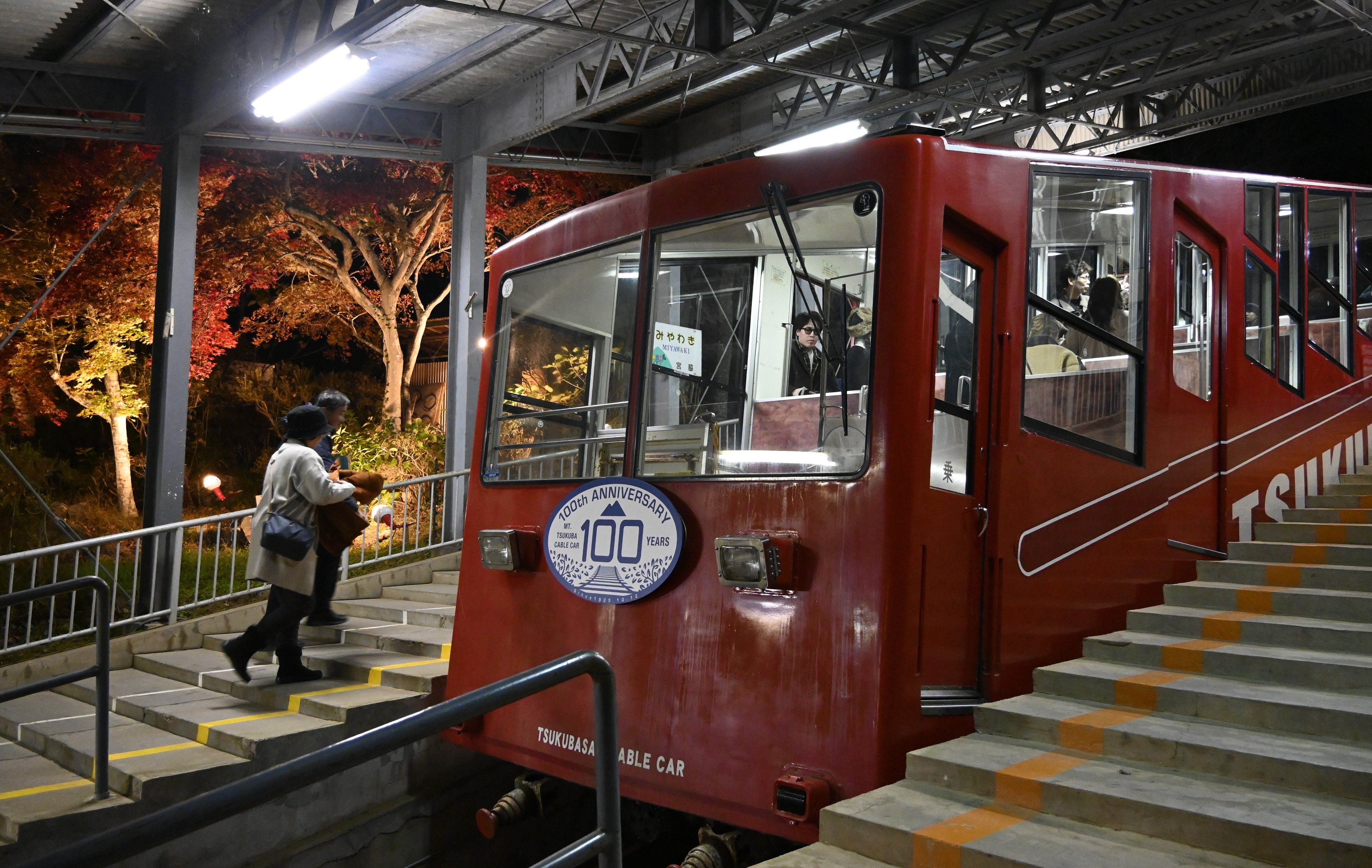 紅葉の下、映える車体 ケーブルカーの夜間運行を堪能 筑波山(茨城・つくば)