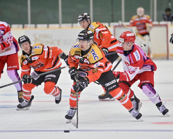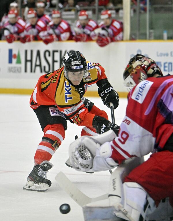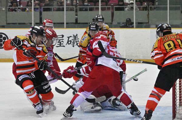 延長戦でペナルティーショットを阻まれるバックスのFW大津=長野市ビッグハット、磯真奈美撮影