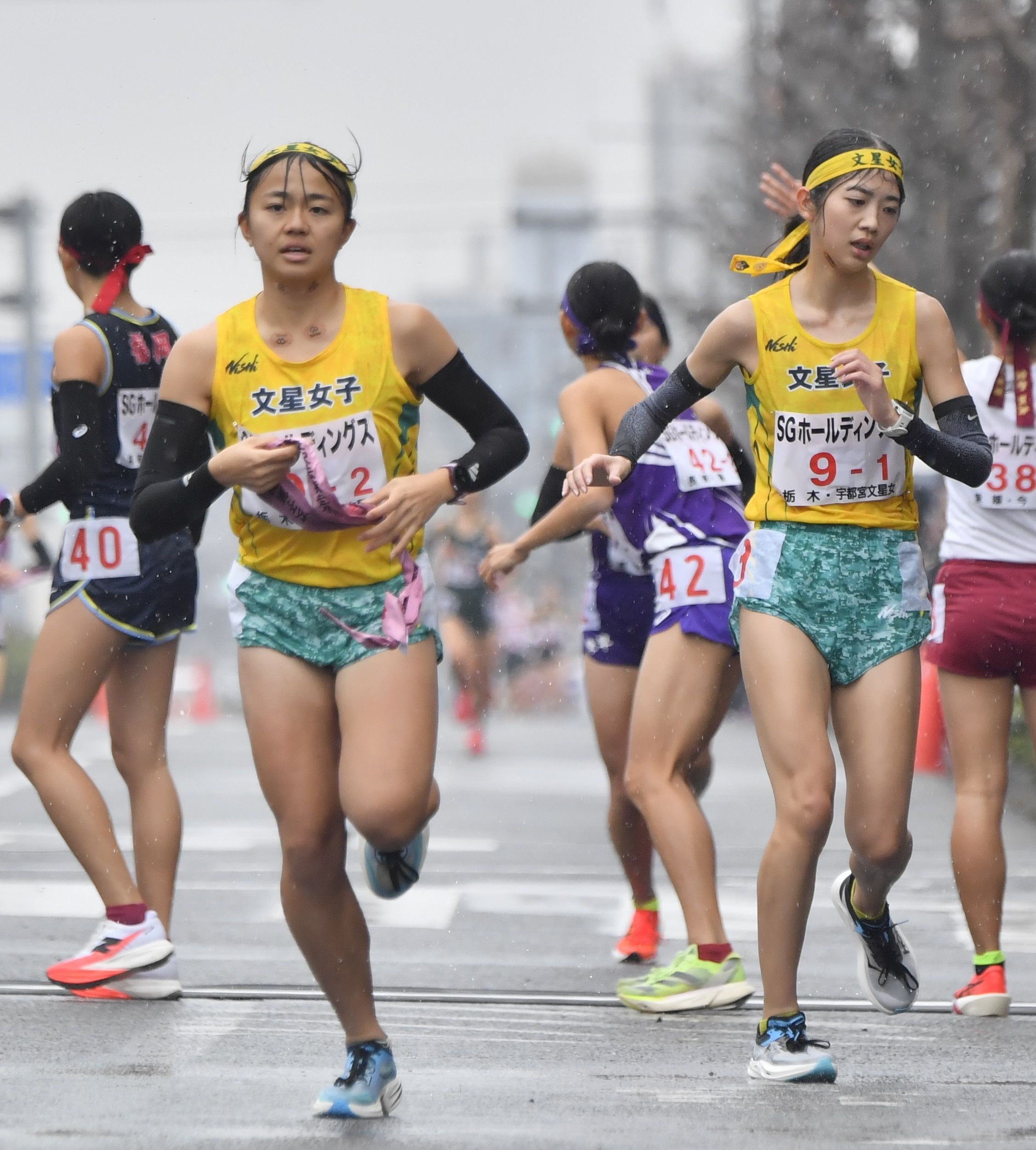 文星女の4区塚原(左)が5区本澤へたすきをつなぐ=京都市内、加藤竜矢撮影