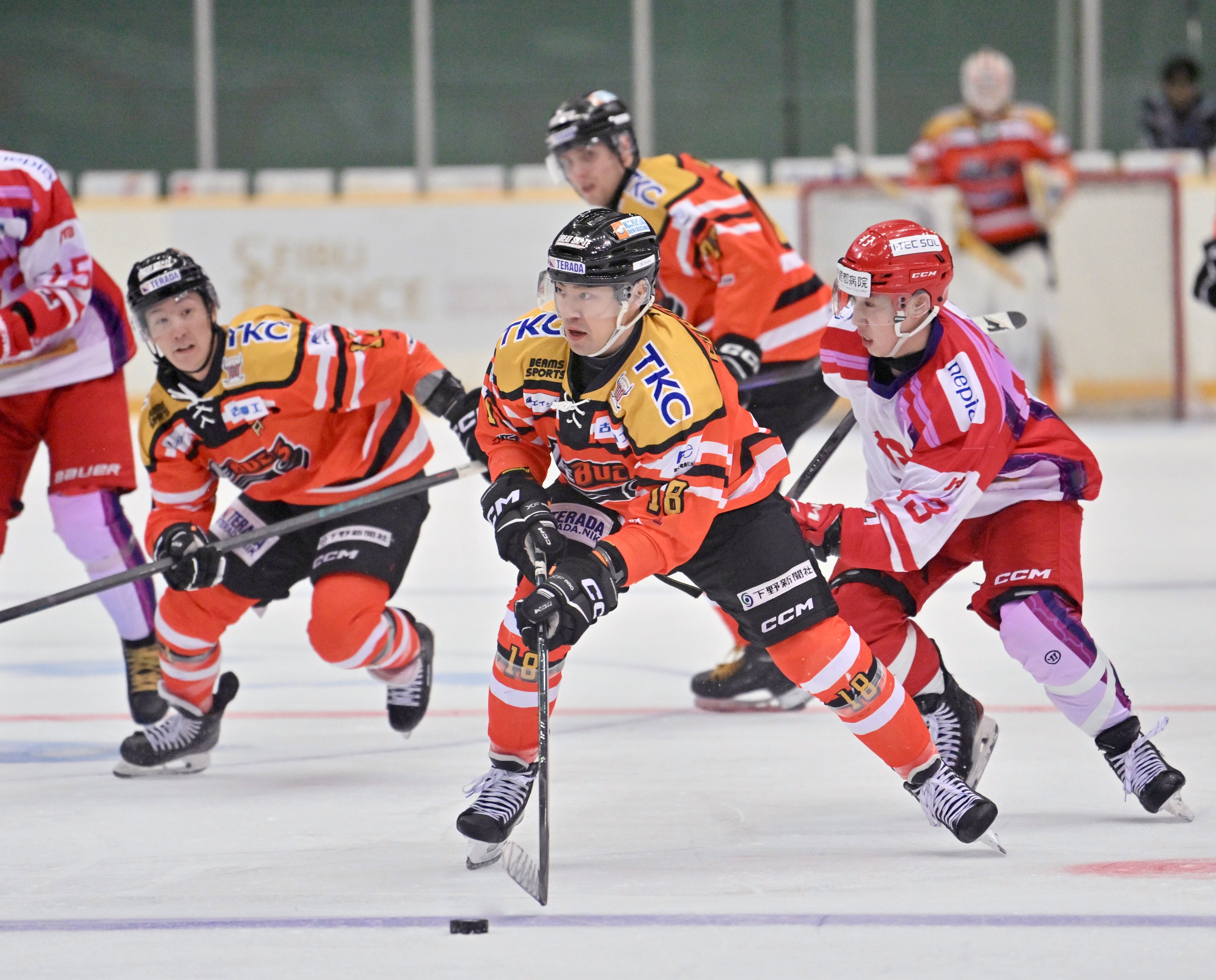 第2ピリオド17分、中盤から抜け出すバックスの古橋(中央)=長野市ビッグハット、磯真奈美撮影