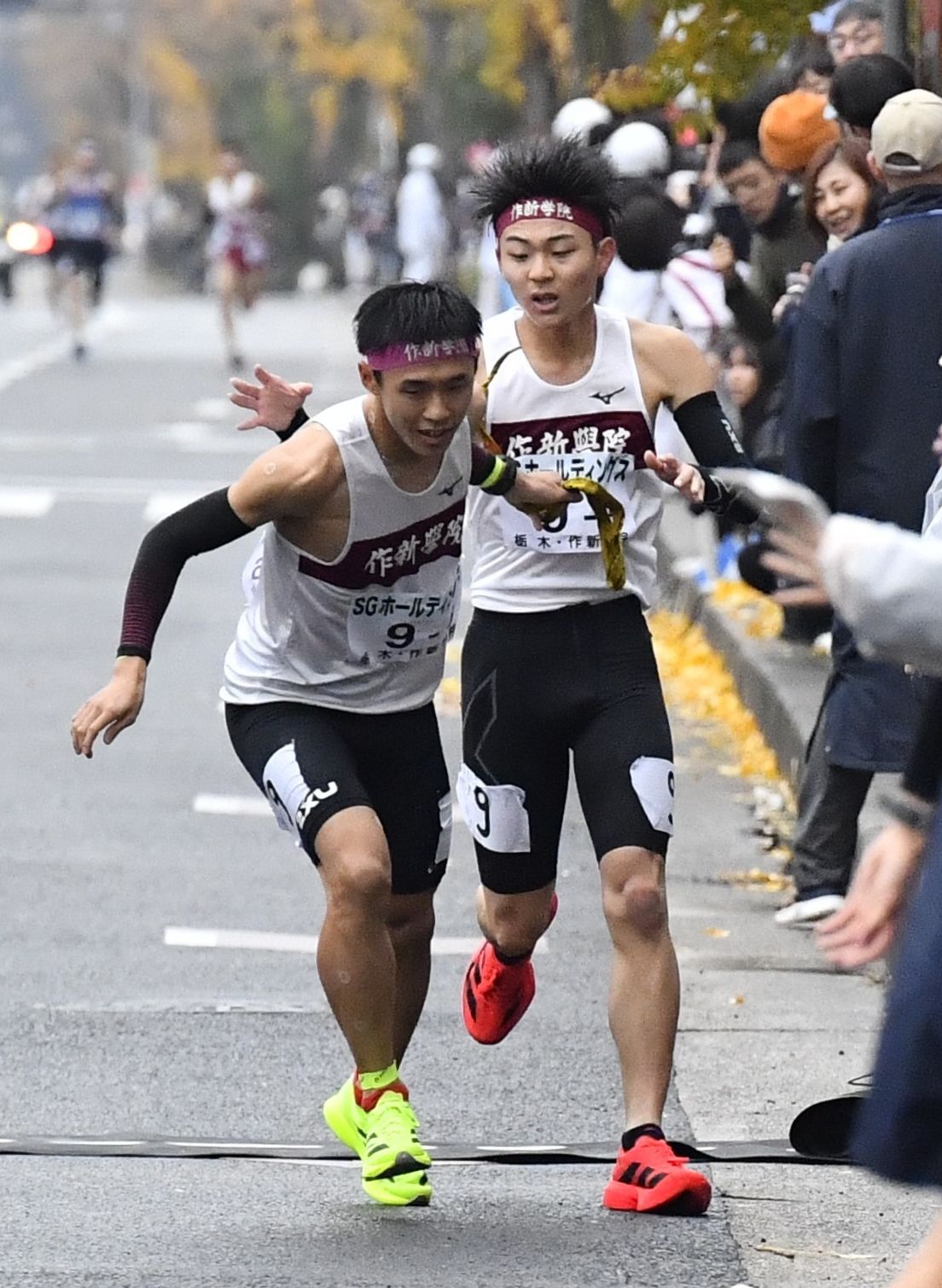 作新の5区山口(右)から6区矢野にたすきをつなぐ=京都市内、内藤大地撮影