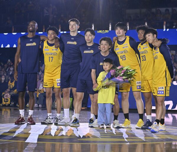 引退セレモニーでブレックスの仲間や子どもと写真に収まる斉藤(左から5人目)=4月8日、ブレックスアリーナ宇都宮