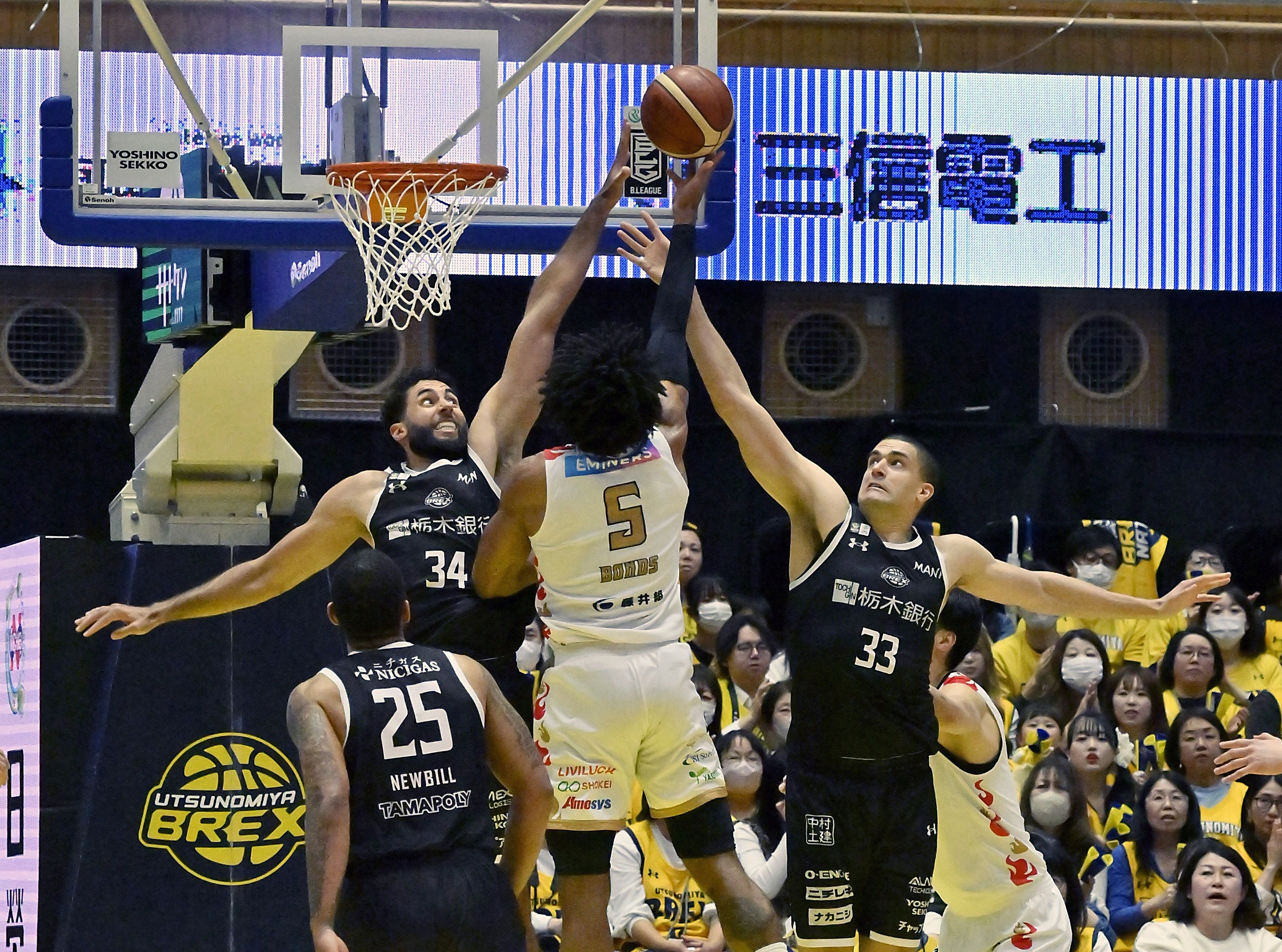 第2クオーター8分、ブレックスのジェレット(奥左)とエドワーズ(同右)がブロックに飛ぶ=ブレックスアリーナ宇都宮、加藤竜矢撮影