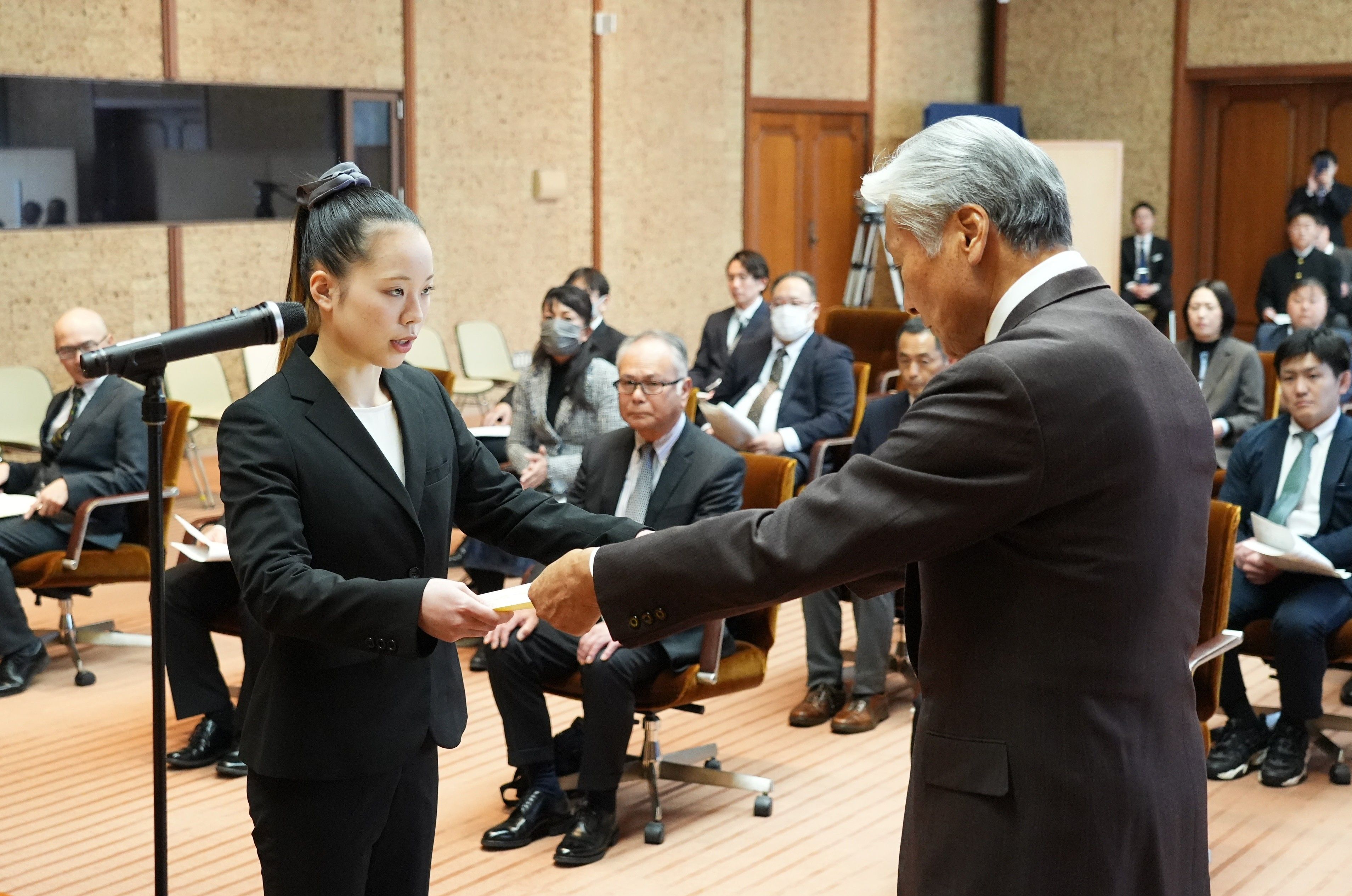 スポーツ優秀選手賞を受賞したスポーツクライミングの葛生(左)=県公館