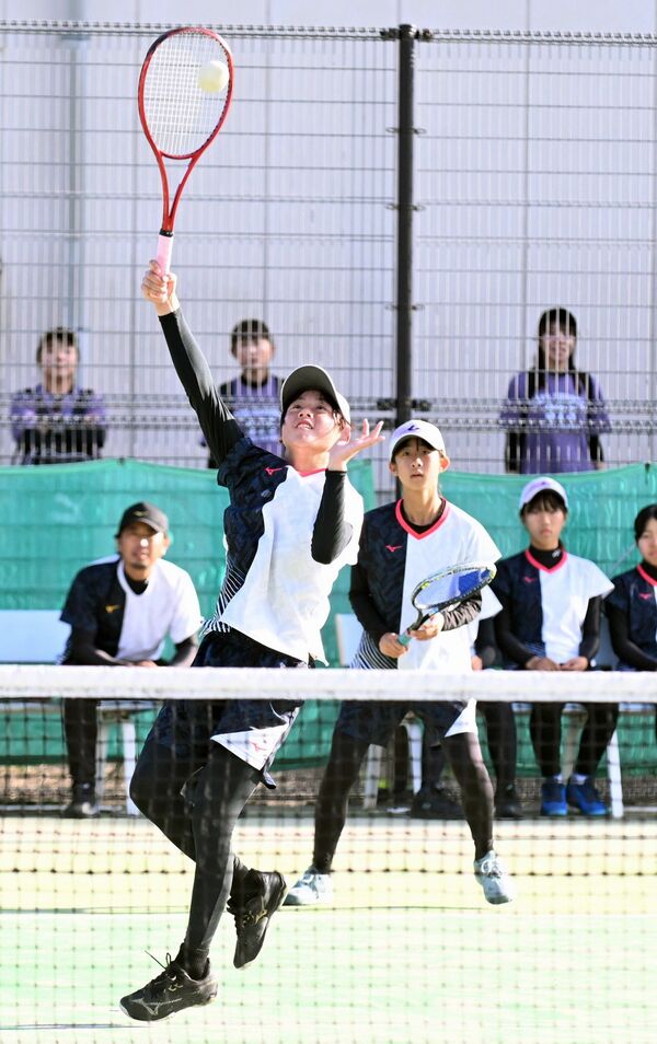 ソフトテニス女子団体決勝 那須塩原STSの瀬戸がボレー。右奥は原田=県総合運動公園テニスコート