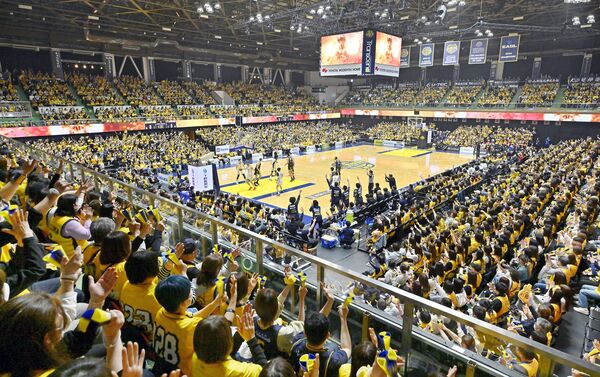 ブレックスが得点するたび、選手たちに拍手や声援を送る大勢のファン=15日午後7時10分、ブレックスアリーナ宇都宮、加藤竜矢撮影