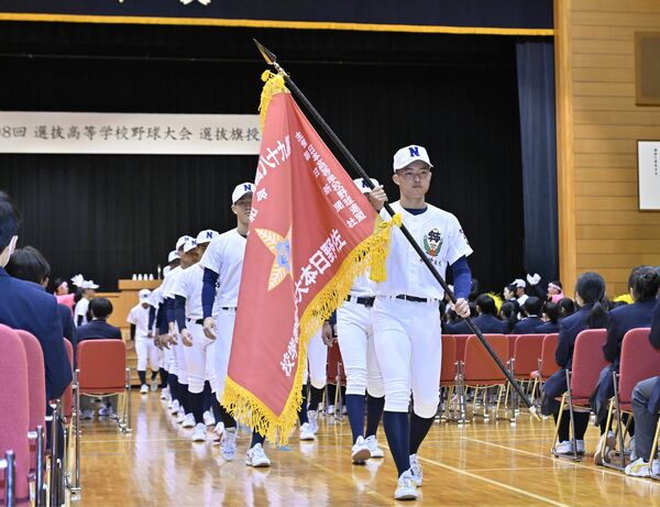 選抜旗を持つ中村主将を先頭に行進する佐野日大野球部の選手たち=佐野日大高プラザ40